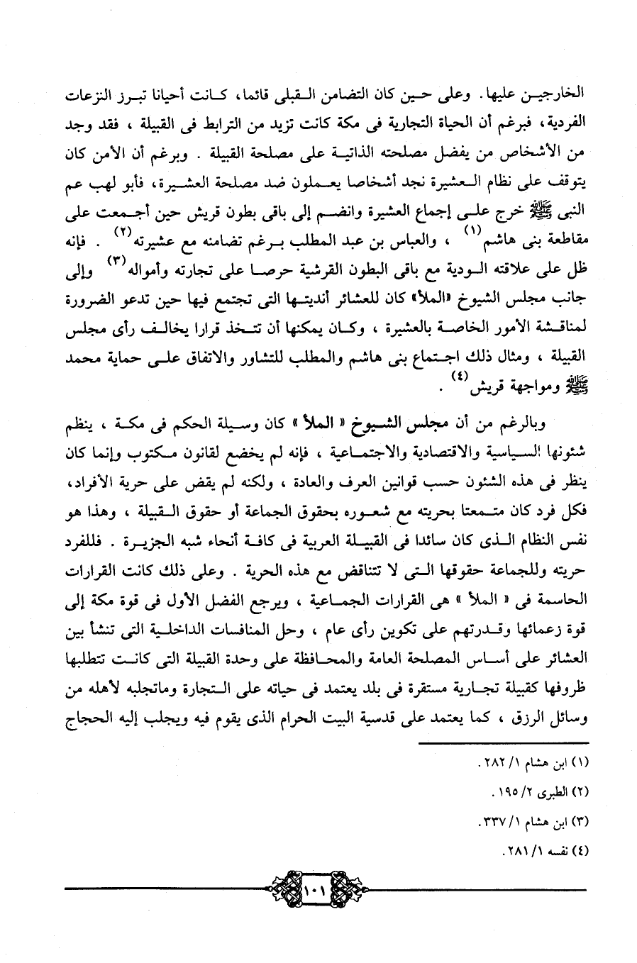 الخارجين عليها. وعلى حين كان التضامن القبلي قائمًا، كانت أحيانًا تبرز النزعات الفردية، فبرغم أن الحياة التجارية في مكة كانت تزيد من الترابط في القبيلة؛ فقد وجد من الأشخاص من يفضل مصلحته الذاتية على مصلحة القبيلة. وبرغم أن الأمن كان يتوقف على نظام العشيرة نجد أشخاصًا يعملون ضد مصلحة العشيرة، فأبو لهب عم النبي -صلى الله عليه وسلم- خرج على إجماع العشيرة وانضم إلى باقي بطون قريش حين أجمعت على مقاطعة بني هشام1، والعباس بن عبد المطلب برغم تضامنه مع عشيرته2؛ فإنه ظل على علاقته الودية مع باقي البطون القرشية حرصًا على تجارته وأمواله3 وإلى جانب مجلس الشيوخ -الملأ- كان للعشائر أنديتها التي تجتمع فيها حين تدعو الضرورة لمناقشة الأمور الخاصة بالعشيرة، وكان يمكنها أن تتخذ قرارًا يخالف رأي مجلس القبيلة، ومثال ذلك اجتماع بني هاشم والمطلب للتشاور والاتفاق على حماية محمد -صلى الله عليه وسلم- ومواجهة قريش4.