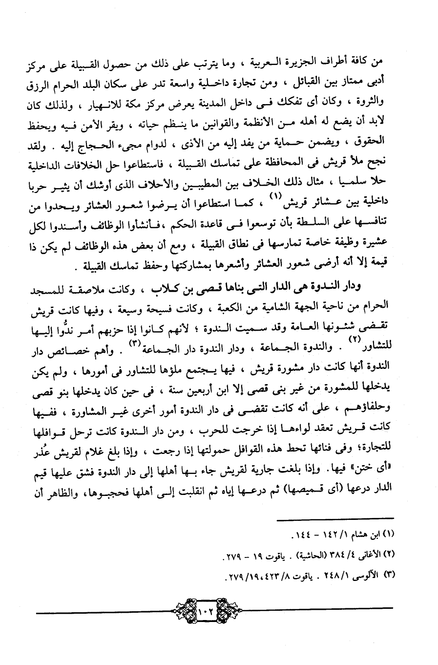 ودار الندوة هي الدار التي بناها قصي بن كلاب، وكانت ملاصقة للمسجد الحرام من ناحية الجهة الشامية من الكعبة، وكانت فسيحة وسيعة، وفيها كانت قريش تقضي شئونها العامة وقد سميت الندوة؛ لأنهم كانوا إذا حزبهم أمر ندوا إليها للتشاور2. والندوة الجماعة، ودار الندوة دار الجماعة3. وأهم خصائص دار الندوة أنها كانت دار مشورة قريش، فيها يجتمع ملؤها للتشاور في أمورها، ولم يكن يدخلها للمشورة من غير بني قصي إلا ابن أربعين سنة، في حين كان يدخلها بنو قصي وحلفاؤهم، على أنه كانت تقضى في دار الندوة أمور أخرى غير المشاروة، ففيها كانت قريش تعقد لواءها إذا خرجت للحرب، ومن دار الندوة كانت ترحل قوافلها للتجارة؛ وفي فنائها تحط هذه القوافل حمولتها إذا رجعت، وإذا بلغ غلام لقريش عذر أي ختن فيها. وإذا بلغت جارية لقريش جاء بها أهلها إلى دار الندوة فشق عليها قيم الدار درعها -أي قميصها- ثم درعها إياه، ثم انقلبت إلى أهلها فحجبوها، والظاهر أن