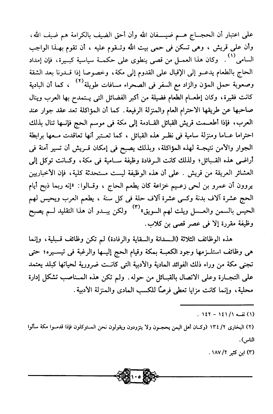 على اعتبار أن الحجاج هم ضيفان الله وأن أحق الضيف بالكرامة هم ضيف الله، وأن على قريش -وهي تسكن في حمى بيت الله وتقوم عليه- أن تقوم بهذا الواجب السامي1. وكان هذا العمل من قصي ينطوي على حكمة سياسية كبيرة؛ فإن إمداد الحاج بالطعام يدعو إلى الإقبال على القدوم إلى مكة، وخصوصًا إذا قدرنا بعد الشقة وصعوبة حمل المؤن والزاد مع السفر في الصحراء مسافات طويلة2، كما أن البادية كانت فقيرة وكان إطعام الطعام فضيلة من أكبر الفضائل التي يتمدح بها العرب وينال صاحبها عن طريقها الاحترام العام والمنزلة الرفيعة. كما أن المؤاكلة تعد عقد جوار عند العرب، فإذا أطعمت قريش القبائل القادمة إلى مكة في موسم الحج فإنها تنال بذلك احترامًا عامًّا، ومنزلة سامية في نظر هذه القبائل، كما تعتبر أنها تعاقدت معها برابطة الجوار والأمن نتيجة لهذه المؤاكلة، وبذلك يصبح في إمكان قريش أن تسير آمنة في أراضي هذه القبائل؛ ولذلك كانت الرفادة وظيفة سامية في مكة، وكانت توكل إلى العشائر العريقة من قريش. على أن هذه الوظيفة ليست مستحدثة كلية؛ فإن الأخباريين يروون أن عمرو بن لحي زعيم خزاعة كان يطعم الحاج، وقالوا: إنه ربما ذبح أيام الحج عشرة آلاف بدنة وكسا عشرة آلاف حلة في كل سنة، يطعم العرب ويحيس لهم الحيس بالسمن والعسل ويلت لهم السويق3؛ ولكن يبدو أن هذا التقليد لم يصبح وظيفة مقررة إلا في عصر قصي بن كلاب.