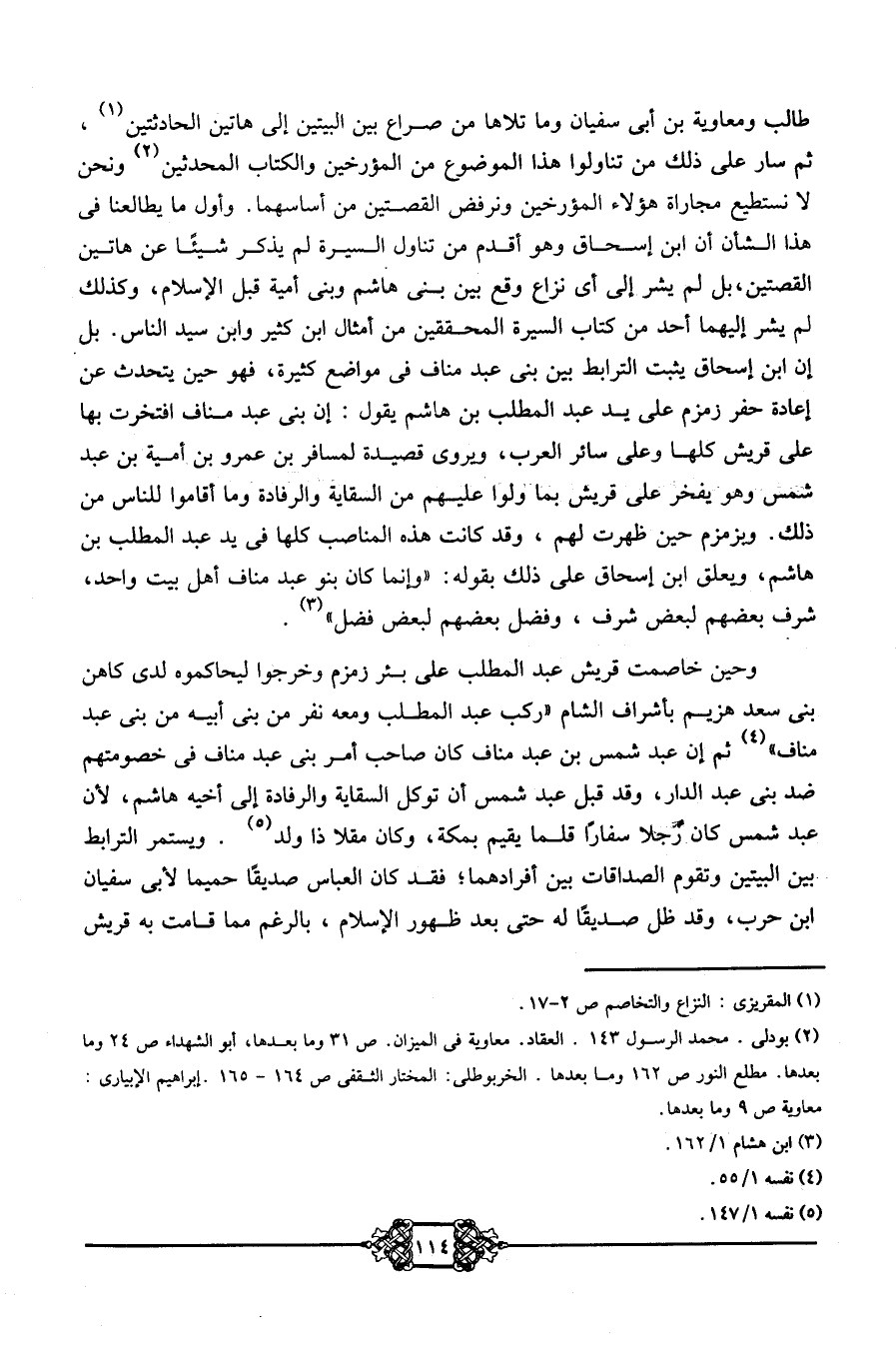 طالب ومعاوية بن أبي سفيان وما تلاها من صراع بين البيتين إلى هاتين الحادثتين1، ثم سار على ذلك من تناولوا هذا الموضوع من المؤرخين والكتاب المحدثين2 ونحن لا نستطيع مجاراة هؤلاء المؤرخين ونرفض القصتين من أساسهما. وأول ما يطالعنا في هذا الشأن أن ابن إسحاق -وهو أقدم من تناول السيرة- لم يذكر شيئًا عن هاتين القصتين، بل لم يشر إلى أي نزاع وقع بين بني هاشم وبني أمية قبل الإسلام، وكذلك لم يشر إليهما أحد من كتاب السيرة المحققين، من أمثال ابن كثير وابن سيد الناس؛ بل إن ابن إسحاق يثبت الترابط بين بني عبد مناف في مواضع كثيرة، فهو حين يتحدث عن إعادة حفر زمزم على يد عبد المطلب بن هاشم يقول: إن بني عبد مناف افتخرت بها على قريش كلها وعلى سائر العرب، ويروي قصيدة لمسافر بن عمرو بن أمية بن عبد شمس وهو يفخر على قريش بما ولوا عليهم من السقاية والرفادة وما أقاموا للناس من ذلك, وبزمزم حين ظهرت لهم، وقد كانت هذه المناصب كلها في يد عبد المطلب بن هاشم، ويعلق ابن إسحاق على ذلك بقوله: وإنما كان بنو عبد مناف أهل بيت واحد, شرف بعضهم لبعض شرف، وفضل بعضهم لبعض فضل.3