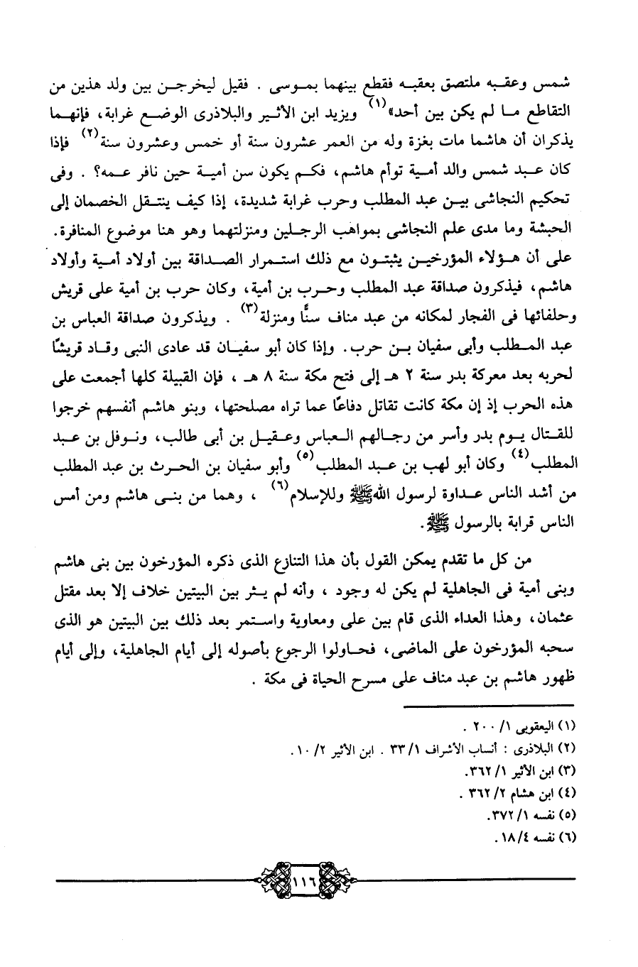 شمس وعقبة ملتصق بعقبه فقطع بينهما بموسى. فقيل ليخرجن بين ولد هذين من التقاطع ما لم يكن بين أحد1، ويزيد ابن الأثير والبلاذري الوضع غرابة؛ فإنهما يذكران أن هاشمًا مات بغزة وله من العمر عشرون سنة أو خمس وعشرون سنة2 فإذا كان عبد شمس والد أمية توأم هاشم، فكم يكون سن أمية حين نافر عمه؟ وفي تحكيم النجاشي بين عبد المطلب وحرب غرابة شديدة، إذ كيف ينتقل الخصمان إلى الحبشة وما مدى علم النجاشي بمواهب الرجلين ومنزلتهما وهو هنا موضوع المنافرة. على أن هؤلاء المؤرخين يثبتون مع ذلك استمرار الصداقة بين أولاد أمية وأولاد هاشم، فيذكرون صداقة عبد المطلب وحرب بن أمية، وكان حرب بن أمية على قريش وحلفائها في الفجار لمكانه من عبد مناف سنًّا ومنزلةً3. ويذكرون صداقة العباس بن عبد المطلب وأبي سفيان بن حرب. وإذا كان أبو سفيان قد عادى النبي وقاد قريشًا لحربه بعد معركة بدر سنة 2هـ إلى فتح مكة سنة 8هـ؛ فإن القبيلة كلها أجمعت على هذه الحرب إذ إن مكة كانت تقاتل دفاعًا عما تراه مصلحتها، وبنو هاشم أنفسهم خرجوا للقتال يوم بدر وأسر من رجالهم العباس, وعقيل بن أبي طالب، ونوفل بن عبد المطلب4 وكان أبو لهب بن عبد المطلب5 وأبو سفيان بن الحارث بن عبد المطلب من أشد الناس عداوة لرسول الله -صلى الله عليه وسلم- وللإسلام6، وهما من بني هاشم ومن أمس الناس قرابة بالرسول -صلى الله عليه وسلم.