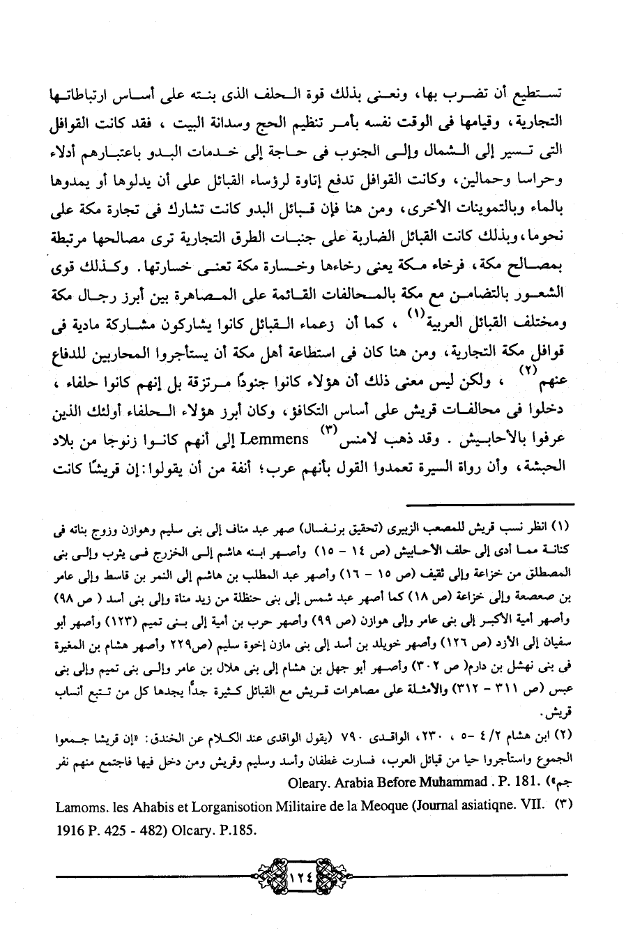 تستطيع أن تضرب بها، ونعني بذلك قوة الحلف الذي بنته على أساس ارتباطاتها التجارية، وقيامها في الوقت نفسه بأمر تنظيم الحج وسدانة الوقت، فقد كانت القوافل التي تسير إلى الشمال وإلى الجنوب في حاجة إلى خدمات البدو باعتبارهم أدلاء وحراسًا وحمالين، وكانت القوافل تدفع إتاوة لرؤساء القبائل على أن يدلوها أو يمدوها بالماء وبالتموينات الأخرى، ومن هنا فإن قبائل البدو كانت تشارك في تجارة مكة على نحو ما، وبذلك كانت القبائل الضاربة على جنبات الطرق التجارية ترى مصالحها مرتبطة بمصالح مكة، فرخاء مكة يعني رخاءها وخسارة مكة تعني خسارتها. وكذلك قوي الشعور بالتضامن مع مكة بالمحالفات القائمة على المصاهرة بين أبرز رجال مكة ومختلف القبائل العربية 1، كما أن زعماء القبائل كانوا يشاركون مشاركة مادية في قوافل مكة التجارية, ومن هنا كان في استطاعة أهل مكة أن يستأجروا المحاربين للدفاع عنهم 2, ولكن ليس معنى ذلك أن هؤلاء كانوا جنودًا مرتزقة بل إنهم كانوا حلفاء، دخلوا في محالفات قريش على أساس التكافؤ، وكان أبرز هؤلاء الحلفاء أولئك الذين عرفوا بالأحابيش. وقد ذهب لامنس3 Lemmens إلى أنهم كانوا زنوجًا من بلاد الحبشة، وأن رواة السيرة تعمدوا القول بأنهم عرب؛ أنفة من أن يقولوا: إن قريشًا كانت