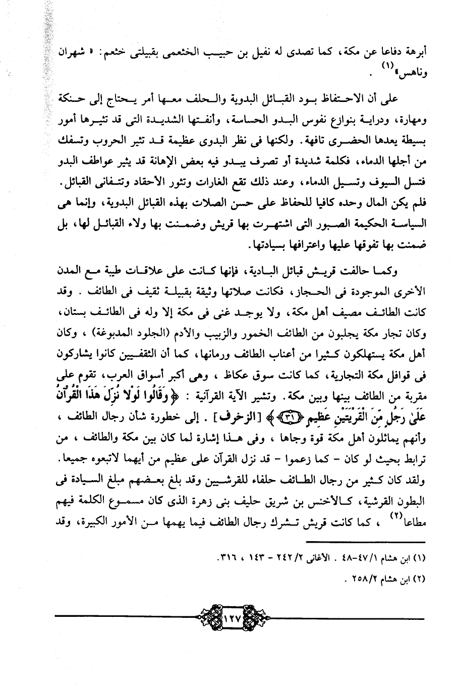 وكما حالفت قريش قبائل البادية؛ فإنها كانت على علاقات طيبة مع المدن الأخرى الموجودة في الحجاز، فكانت صلاتها وثيقة بقبيلة ثقيف في الطائف. وقد كانت الطائف مصيف أهل مكة، ولا يوجد غني في مكة إلا وله في الطائف بستان، وكان تجار مكة يجلبون من الطائف الخمور والزبيب والأدم -الجلود المدبوغة- وكان أهل مكة يستهلكون كثيرًا من أعناب الطائف ورمانها، كما أن الثفيين كانوا يشاركون في قوافل مكة التجارية، كما كانت سوق عكاظ -وهي أكبر أسواق العرب- تقوم على مقربة من الطائف بينها وبين مكة. وتشير الآية القرآنية: {وَقَالُوا لَوْلا نُزِّلَ هَذَا الْقُرْآنُ عَلَى رَجُلٍ مِنَ الْقَرْيَتَيْنِ عَظِيم} [الزخرف] . إلى خطورة شأن رجال الطائف، وأنهم يماثلون أهل مكة قوة وجاهًا، وفي هذا إشارة لما كان بين مكة والطائف من ترابط، بحيث لو كان -كما زعموا- قد نزل القرآن على عظيم من أيهما لاتبعوه جميعًا. ولقد كان كثير من رجال الطائف حلفاء للقرشيين، وقد بلغ بعضهم مبلغ السيادة في البطون القرشية، كالأخنس بن شريق حليف بني زهرة الذي كان مسموع الكلمة فيهم مطاعًا2، كما كانت قريش تشرك رجال الطائف فيما يهمها من الأمور الكبيرة، وقد