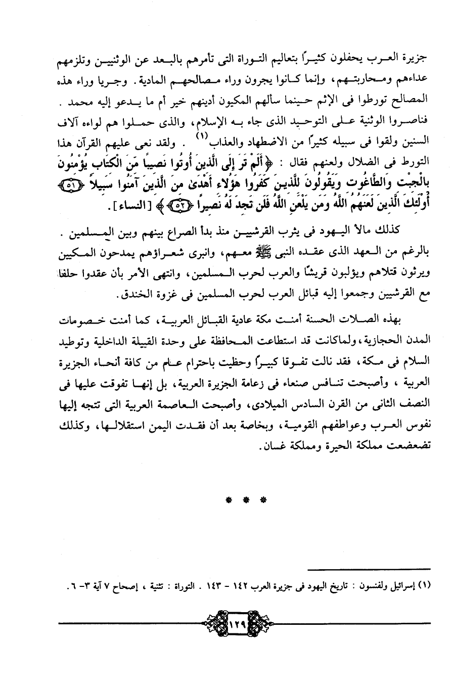 جزيرة العرب يحفلون كثيرًا بتعاليم التوراة التي تأمرهم بالبعد عن الوثنيين وتلزمهم عداءهم ومحاربتهم، وإنما كان يجرون وراء مصالحهم المادية. وجريًا وراء هذه المصالح تورطوا في الإثم حينما سألهم المكيون أدينهم خير، أم ما يدعو إليه محمد؟ فناصروا الوثنية على التوحيد الذي جاء به الإسلام، والذي حملوا هم لواءه آلاف السنين ولقوا في سبيله كثيرًا من الاضطهاد والعذاب1. ولقد نعى عليهم القرآن هذا التورط في الضلال ولعنهم فقال: {أَلَمْ تَرَ إِلَى الَّذِينَ أُوتُوا نَصِيبًا مِنَ الْكِتَابِ يُؤْمِنُونَ بِالْجِبْتِ وَالطَّاغُوتِ وَيَقُولُونَ لِلَّذِينَ كَفَرُوا هَؤُلاءِ أَهْدَى مِنَ الَّذِينَ آمَنُوا سَبِيلًا، أُوْلَئِكَ الَّذِينَ لَعَنَهُمُ اللَّهُ وَمَنْ يَلْعَنِ اللَّهُ فَلَنْ تَجِدَ لَهُ نَصِيرًا} [النساء] .