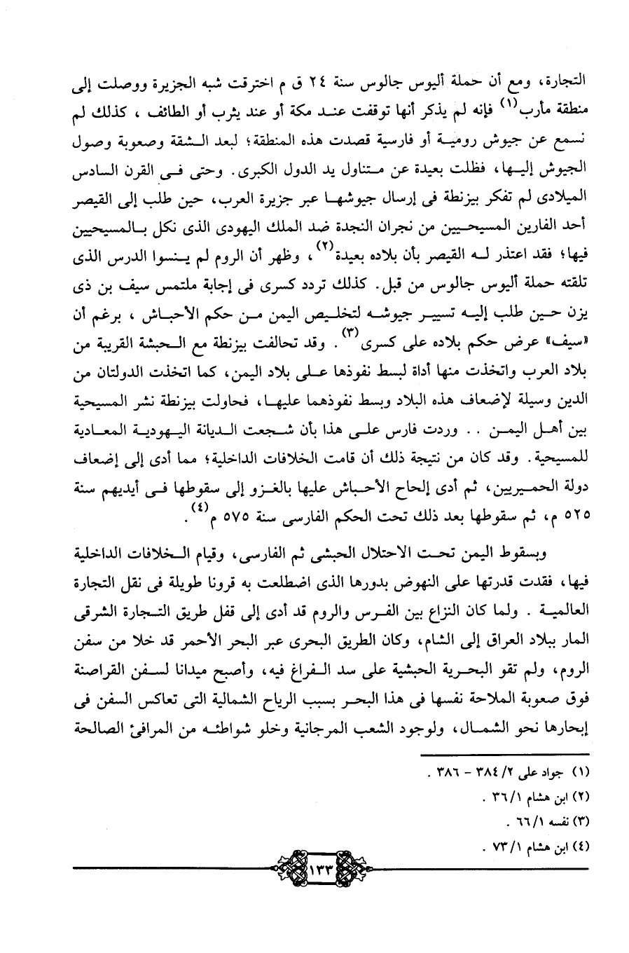 التجارة، ومع أن حملة أليوس جالوس سنة 24 ق م اخترقت شبه الجزيرة ووصلت إلى منطقة مأرب1 فإنه لم يذكر أنها توقفت عند مكة أو عند يثرب أو الطائف، كذلك لم نسمع عن جيوش رومية أو فارسية قصدت هذه المنطقة؛ لبعد الشقة وصعوبة وصول الجيوش إليها، فظلت بعيدة عن متناول يد الدول الكبرى. وحتى في القرن السادس الميلادي لم تفكر بيزنطة في إرسال جيوشها عبر جزيرة العرب، حين طلب إلى القيصر أحد الفارين المسيحيين من نجران النجدة ضد الملك اليهودي الذي نكل بالمسيحيين فيها، فقد اعتذر له القيصر بأن بلاده بعيدة2، وظهر أن الروم لم ينسوا الدرس الذي تلقته حملة أليوس جالوس من قبل. كذلك تردد كسرى في إجابة ملتمس سيف بن ذي يزن حين طلب إليه تسيير جيوشه لتخليص اليمن من حكم الأحباش، برغم أن سيف عرض حكم بلاده على كسرى3. وقد تحالفت بيزنطة مع الحبشة القريبة من بلاد العرب واتخذت منها أداة لبسط نفوذها على بلاد اليمن، كما اتخذت الدولتان من الدين وسيلة لإضعاف هذه البلاد وبسط نفوذهما عليها، فحاولت بيزنطة نشر المسيحية بين أهل اليمن.. وردت فارس على هذا بأن شجعت الديانة اليهودية المعادية للمسيحية. وقد كان من نتيجة ذلك أن قامت الخلافات الداخلية؛ مما أدى إلى إضعاف دولة الحميريين، ثم أدى إلحاح الأحباش عليها بالغزو إلى سقوطها في أيديهم سنة 525 م، ثم سقوطها بعد ذلك تحت الحكم الفارسي سنة 575م 4.