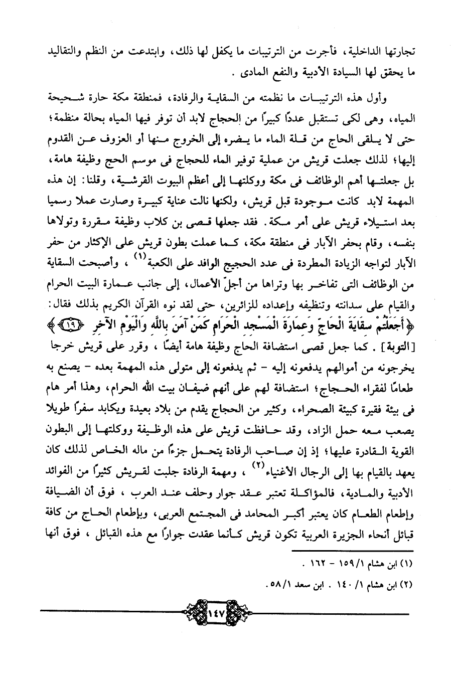 وأول هذه الترتيبات ما نظمته من السقاية والرفادة؛ فمنطقة مكة حارة شحيحة المياه، وهي لكي تستقبل عددًا كبيرًا من الحجاج لا بد أن توفر فيها المياه بحالة منظمة؛ حتى لا يلقى الحاج من قلة الماء ما يضره إلى الخروج منها أو العزوف عن القدوم إليها؛ لذلك جعلت قريش من عملية توفير الماء للحجاج في موسم الحج وظيفة هامة، بل جعلتها أهم الوظائف في مكة ووكلتها إلى أعظم البيوت القرشية، وقلنا: إن هذه المهمة لا بد كانت موجودة قبل قريش، ولكنها نالت عناية كبيرة وصارت عملًا رسميًّا بعد استيلاء قريش على أمر مكة. فقد جعلها قصي بن كلاب وظيفة مقررة وتولاها بنفسه، وقام بحفر الآبار في منطقة مكة، كما عملت بطون قريش على الإكثار من حفر الآبار لتواجه الزيادة المطردة في عدد الحجيج الوافد على الكعبة1، وأصبحت السقاية من الوظائف التي تفاخر بها وتراها من أجل الأعمال، إلى جانب عمارة البيت الحرام والقيام على سدانته وتنظيفه وإعداده للزائرين، حتى لقد نوه القرآن الكريم بذلك فقال: {أَجَعَلْتُمْ سِقَايَةَ الْحَاجِّ وَعِمَارَةَ الْمَسْجِدِ الْحَرَامِ كَمَنْ آمَنَ بِاللَّهِ وَالْيَوْمِ الآخِرِ} [التوبة] . كما جعل قصي استضافة الحاج وظيفة هامة أيضًا، وقرر على قريش خرجًا يخرجونه من أموالهم يدفعونه إليه -ثم يدفعونه إلى متولي هذه المهمة بعده- يصنع به طعامًا لفقراء الحجاج؛ استضافة لهم على أنهم ضيفان بيت الله الحرام، وهذا أمر هام في بيئة فقيرة كبيئة الصحراء، وكثير من الحجاج يقدم من بلاد بعيدة ويكابد سفرًا طويلًا يصعب معه حمل الزاد، وقد حافظت قريش على هذه الوظيفة ووكلتها إلى البطون القوية القادرة عليها؛ إذ إن صاحب الرفادة يتحمل جزءًا من ماله الخاص؛ لذلك كان يعهد بالقيام بها إلى الرجال الأغنياء2، ومهمة الرفادة جلبت لقريش كثيرًا من الفوائد الأدبية والمادية، فالمؤاكلة تعتبر عقد جوار وحلف عند العرب، فوق أن الضيافة وإطعام الطعام كان يعتبر أكبر المحامد في المجتمع العربي، وبإطعام الحاج من كافة قبائل أنحاء الجزيرة العربية تكون قريش كأنما عقدت جوارًا مع هذه القبائل، فوق أنها
