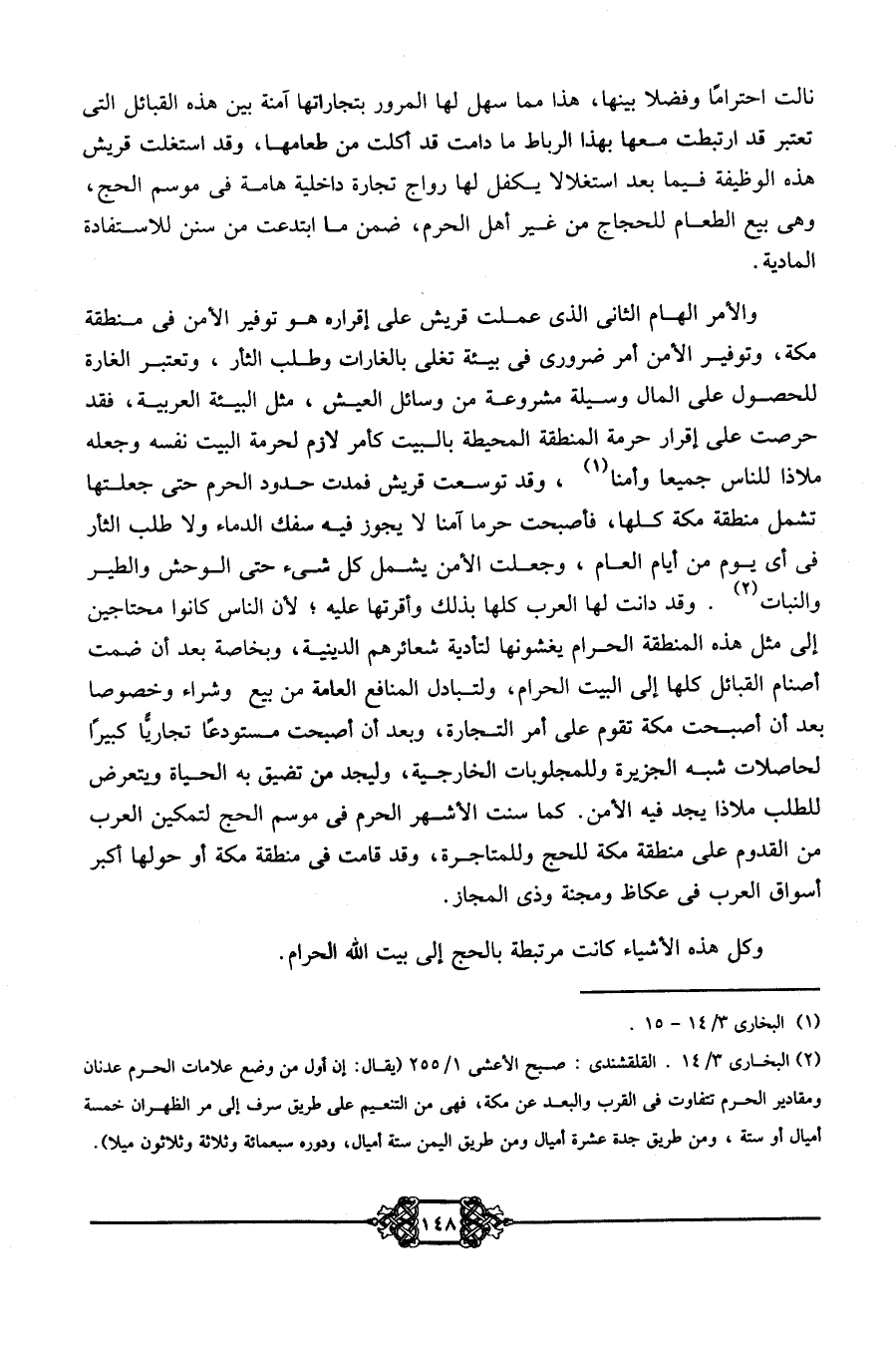والأمر الهام الثاني الذي عملت قريش على إقراره هو توفير الأمن في منطقة مكة، وتوفير الأمن أمر ضروري في بيئة تغلي بالغارات وطلب الثأر، وتعتبر الغارة للحصول على المال وسيلة مشروعة من وسائل العيش مثل البيئة العربية؛ فقد حرصت على إقرار حرمة المنطقة المحيطة بالبيت كأمر لازم لحرمة البيت نفسه وجعله ملاذًا للناس جميعًا وأمنًا1، وقد توسعت قريش فمدت حدود الحرم حتى جعلتها تشمل منطقة مكة كلها، فأصبحت حرمًا آمنًا لا يجوز فيه سفك الدماء ولا طلب الثأر في أي يوم من أيام العام، وجعلت الأمن يشمل كل شيء حتى الوحش والطير والنبات2. وقد دانت لها العرب كلها بذلك وأقرتها عليه؛ لأن الناس كانوا محتاجين إلى مثل هذه المنطقة الحرام يغشونها لتأدية شعائرهم الدينية، وبخاصة بعد أن ضمت أصنام القبائل كلها إلى البيت الحرام، ولتبادل المنافع العامة من بيع وشراء؛ وخصوصًا بعد أن أصبحت مكة تقوم على أمر التجارة، وبعد أن أصبحت مستودعًا تجاريًّا كبيرًا لحاصلات شبه الجزيرة وللمجلوبات الخارجية، وليجد من تضيق به الحياة ويتعرض للطلب ملاذًا يجد فيه الأمن. كما سنت الأشهر الحرم في موسم الحج لتمكين العرب من القدوم على منطقة مكة للحج وللمتاجرة، وقد قامت في منطقة مكة أو حولها أكبر أسواق العرب في عكاظ ومجنة وذي المجاز.