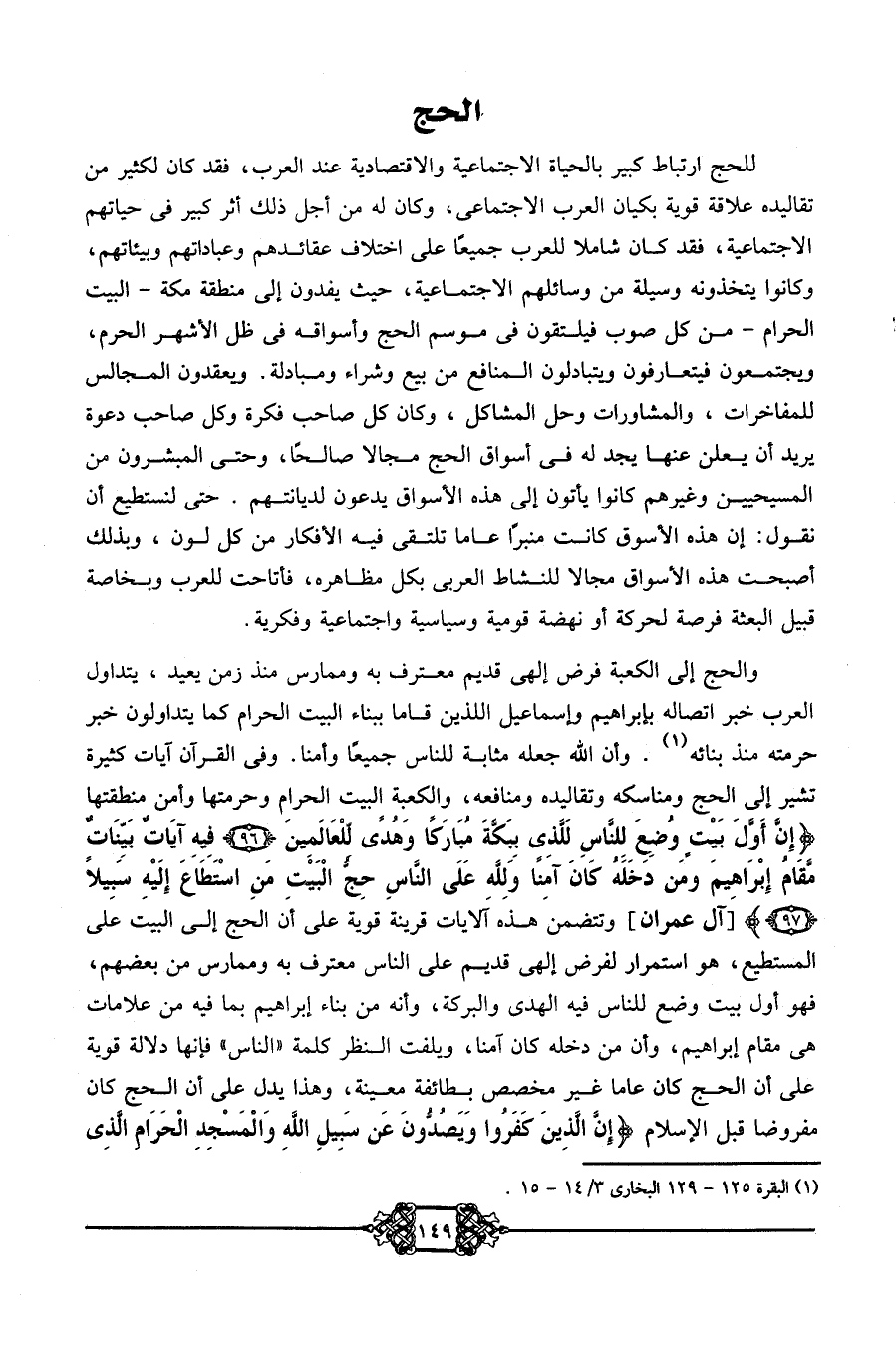 والحج إلى الكعبة فرض إلهي قديم معترف به وممارس منذ زمن بعيد، يتداول العرب خبر اتصاله بإبراهيم وإسماعيل اللذين قاما ببناء البيت الحرام كما يتداولون خبر حرمته منذ بنائه1. وأن الله جعله مثابة للناس جميعًا وأمنًا. وفي القرآن آيات كثيرة تشير إلى الحج ومناسكه وتقاليده ومنافعه، والكعبة البيت الحرام وحرمتها وأمن منطقتها: {إِنَّ أَوَّلَ بَيْتٍ وُضِعَ لِلنَّاسِ لَلَّذِي بِبَكَّةَ مُبَارَكاً وَهُدًى لِلْعَالَمِينَ، فِيهِ آيَاتٌ بَيِّنَاتٌ مَقَامُ إِبْرَاهِيمَ وَمَنْ دَخَلَهُ كَانَ آمِناً وَلِلَّهِ عَلَى النَّاسِ حِجُّ الْبَيْتِ مَنِ اسْتَطَاعَ إِلَيْهِ سَبِيلاً} [آل عمران] وتتضمن هذه الآيات قرينة قوية على أن الحج إلى البيت على المستطيع، هو استمرار لفرض إلهي قديم على الناس معترف به وممارس من بعضهم، فهو أول بيت وضع للناس فيه الهدى والبركة، وأنه من بناء إبراهيم بما فيه من علامات هي مقام إبراهيم، وأن من دخله كان آمنًا، ويلفت النظر كلمة الناس فإنها دلالة قوية على أن الحج كان عامًّا غير مخصص بطائفة معينة، وهذا يدل على أن الحج كان مفروضًا قبل الإسلام: {إِنَّ الَّذِينَ كَفَرُوا وَيَصُدُّونَ عَنِ سَبِيلِ اللَّهِ وَالْمَسْجِدِ الْحَرَامِ الَّذِي