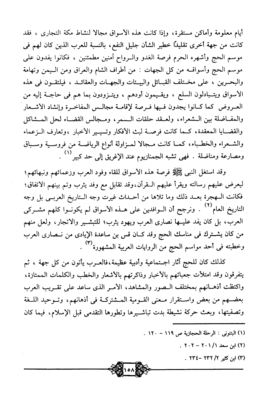 وقد استغل النبي -صلى الله عليه وسلم- فرصة هذه الأسواق للقاء وفود العرب وزعمائهم ونبهائهم؛ ليعرض عليهم رسالته ويقرأ عليهم القرآن، وقد تقابل مع وفد يثرب وتم بينهم الاتفاق؛ فكانت الهجرة بعد ذلك وما تلاها من أحداث غيرت وجه التاريخ العربي بل وجه التاريخ العام2. ونرجح أن الوافدين على هذه الأسواق لم يكونوا كلهم مشركي العرب، بل كان يفد عليها نصارى العرب ويهود يثرب؛ للتبشير والاتجار، ولعل منهم من كان يشترك في مناسك الحج وقد كان قس بن ساعدة الإيادي من نصارى العرب وخطبته في أحد مواسم الحج من الروايات العربية المشهورة3.