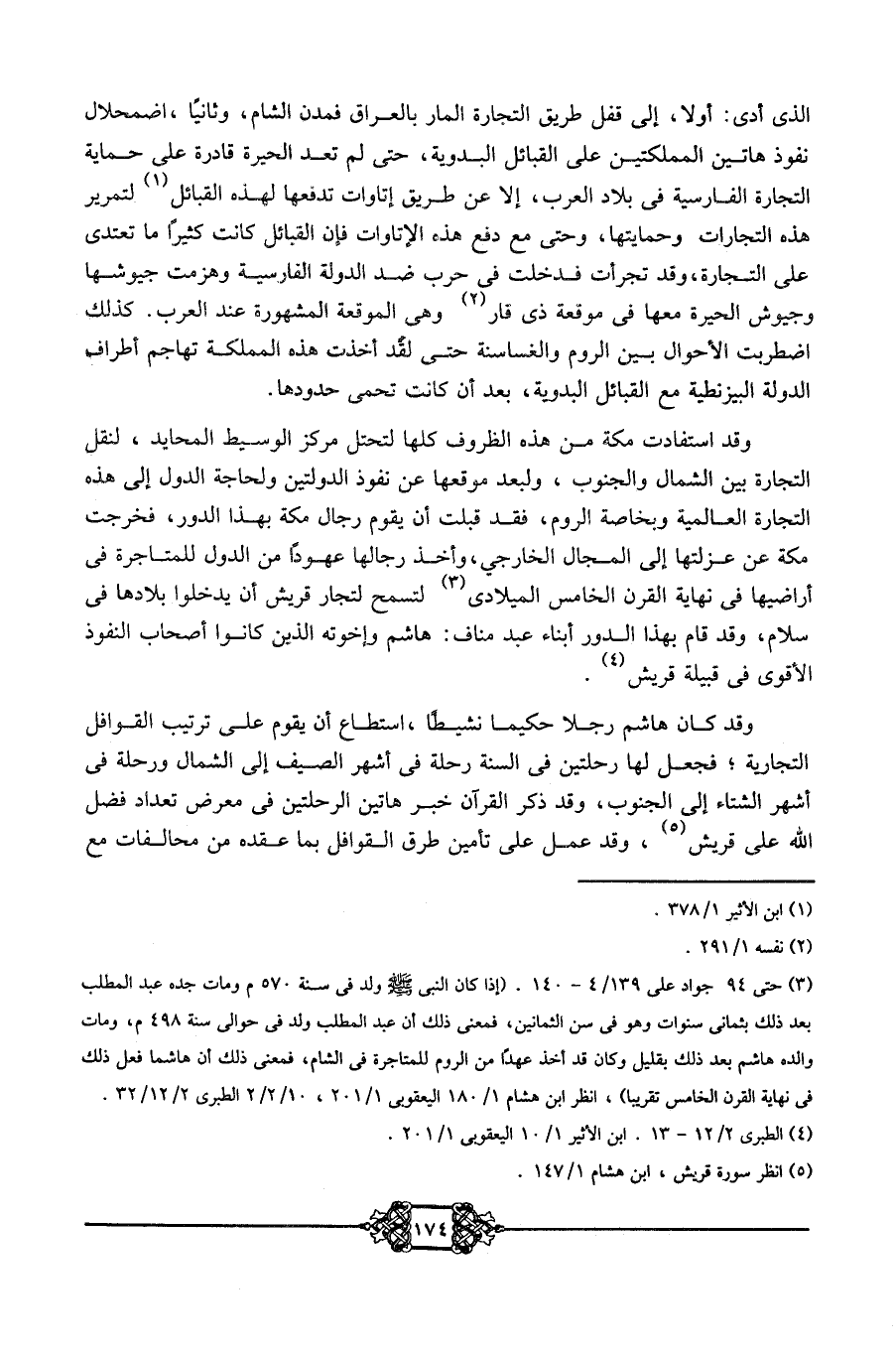 3 حتى 94 جواد علي 4/ 139- 140 "إذا كان النبي -صلى الله عليه وسلم- ولد في سنة 570 م، ومات جده عبد المطلب بعد ذلك بثماني سنوات وهو في سن الثمانين، فمعنى ذلك أن عبد المطلب ولد في حوالي سنة 498 م، ومات والده هاشم بعد ذلك بقليل، وكان قد أخذ عهدًا منن الروم للمتاجرة في الشام، فمعنى ذلك أن هاشمًا فعل ذلك في نهاية القرن الخامس تقريبًا" انظر ابن هشام 1/ 180 اليعقوبي 1/ 201، 10/ 2/2 الطبري 2/ 12/ 32.