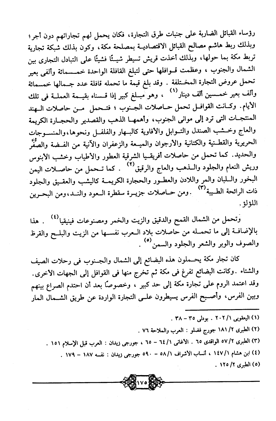 رؤساء القبائل الضاربة على جنبات طرق التجارة، فكان يحمل لهم تجاراتهم دون أجر؛ وبذلك ربط هاشم مصالح القبائل الاقتصادية بمصلحة مكة، وكون بذلك شبكة تجارية تربط مكة بما حولها، وبذلك أخذت قريش تسيطر شيئًا فشيئًا على التبادل التجاري بين الشمال والجنوب، وعظمت قوافلها حتى لتبلغ القافلة الواحدة خمسمائة وألفي بعير تحمل عروض التجارة المختلفة. وقد بلغ قيمة ما تحمله قافلة عدد جمالها خمسمائة وألف بعير خمسين ألف دينار1، وهو مبلغ كبير إذا قِسناه بقيمة العملة في تلك الأيام. وكانت القوافل تحمل حاصلات الجنوب؛ فتحمل من حاصلات الهند المنتجات التي ترد إلى مواني الجنوب، وأهمها الذهب والقصدير والحجارة الكريمة والعاج وخشب الصندل والتوابل والأفاوية كالبهار والفلفل ونحوهما، والمنسوجات الحريرية والقطنية والكتانية والأرجوان والميعة والزعفران والآنية من الفضة والصُّفَّر والحديد. كما تحمل من حاصلات أفريقيا الشرقية العطور والأطياب وخشب الأبنوس وريش النعام والجلود والذهب والعاج والرقيق2. كما تحمل من حاصلات اليمن البخور واللبان والمر واللادن والعطور والحجارة الكريمة كاليشب والعقيق والجلود ذات الرائحة الطيبة3. ومن حاصلات جزيرة سقطرة العود والند، ومن البحرين اللؤلؤ.