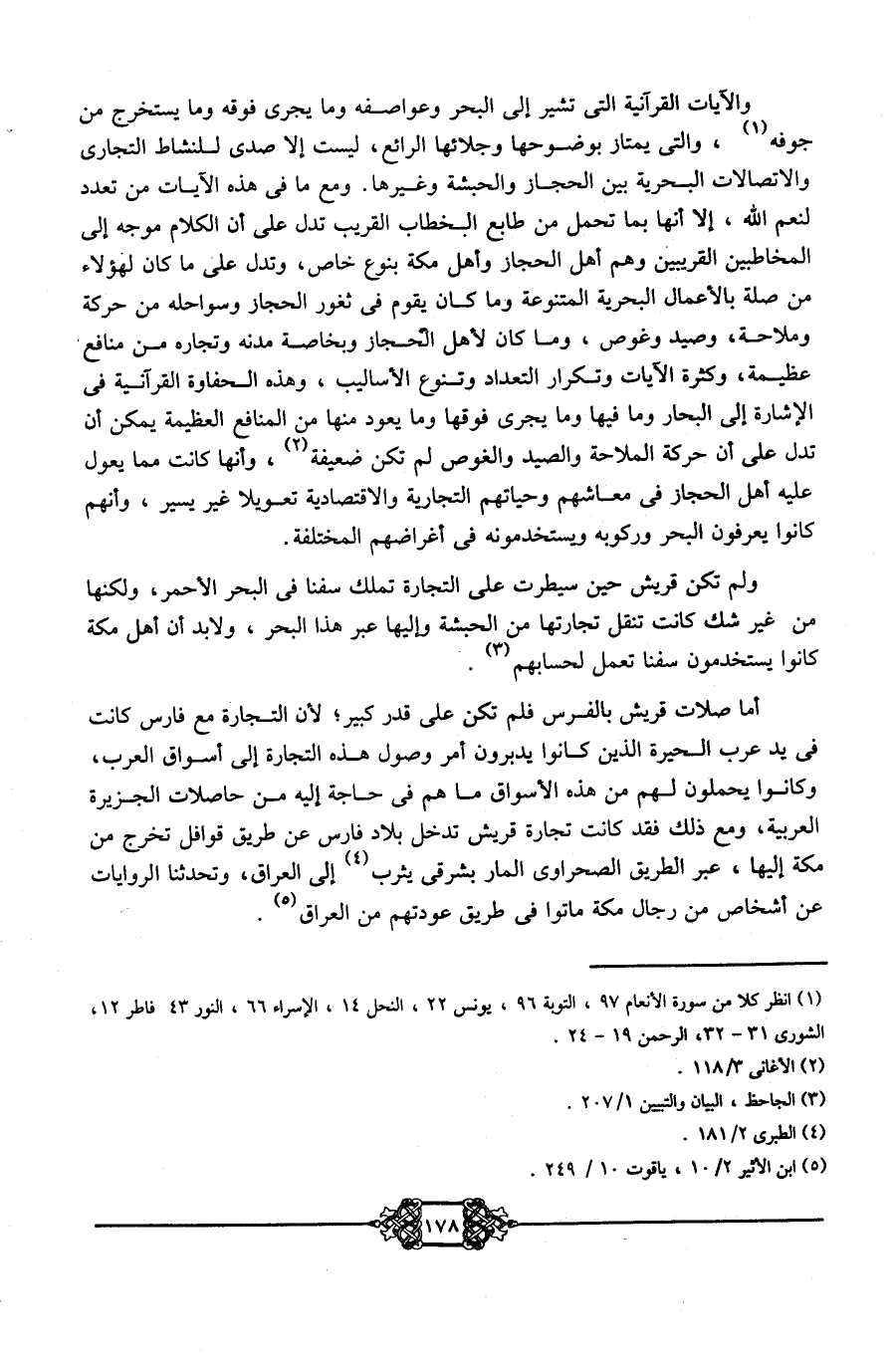 والآيات القرآنية التي تشير إلى البحر وعواصفه وما يجري فوقه وما يستخرج من جوفه1، والتي يمتاز بوضوحها وجلائها الرائع، ليست إلا صدى للنشاط التجاري والاتصالات البحرية بين الحجاز والحبشة وغيرهما. ومع ما في هذه الآيات من تعدد لنعم الله، إلا أنها بما تحمل من طابع الخطاب القريب تدل على أن الكلام موجه إلى المخاطبين القريبين وهم أهل احجاز وأهل مكة بنوع خاص، وتدل على ما كان لهؤلاء من صلة بالأعمال البحرية المتنوعة، وما كان يقوم في ثغور الحجاز وسواحله من حركة وملاحة، وصيد وغوص، وما كان لأهل الحجاز وبخاصة مدنه وتجاره من منافع عظيمة، وكثرة الآيات وتكرار التعداد وتنوع الأساليب، وهذه الحفاوة القرآنية في الإشارة إلى البحار وما فيها وما يجري فوقها وما يعود منها من المنافع العظيمة يمكن أن تدل على أن حركة الملاحة والصيد والغوص لم تكن ضعيفة2، وأنها كانت مما يعول عليه أهل الحجاز في معاشهم وحياتهم التجارية والاقتصادية تعويلًا غير يسير، وأنهم كانوا يعرفون البحر وركوبه ويستخدمونه في أغراضهم المختلفة.