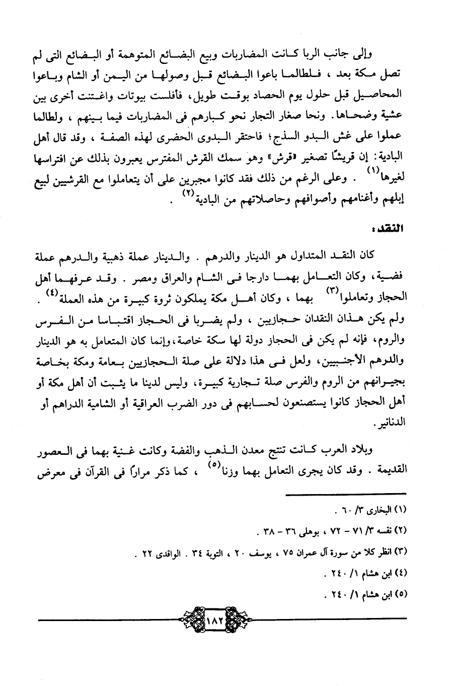كان النقد المتداول هو الدينار والدرهم. والدينار عملة ذهبية والدرهم عملة فضية، وكان التعامل بهما دارجًا في الشام والعراق ومصر. وقد عرفهما أهل الحجاز وتعاملوا1 بهما، وكان أهل مكة يملكون ثروة كبيرة من هذه العملة2. ولم يكن هذان النقدان حجازيين، ولم يضربا في الحجاز اقتباسًا من الفرس والروم؛ فإنه لم يكن في الحجاز دولة لها سكة خاصة؛ وإنما كان المتعامل به هو الدينار والدرهم الأجنبيين، ولعل في هذا دلالة على صلة الحجازيين بعامة ومكة بخاصة بجيرانهم من الروم والفرس صلة تجارية كبيرة، وليس لدينا ما يثبت أن أهل مكة أو أهل الحجاز كانوا يستصنعون لحسابهم في دور الضرب العراقية أو الشامية الدراهم أو الدنانير.