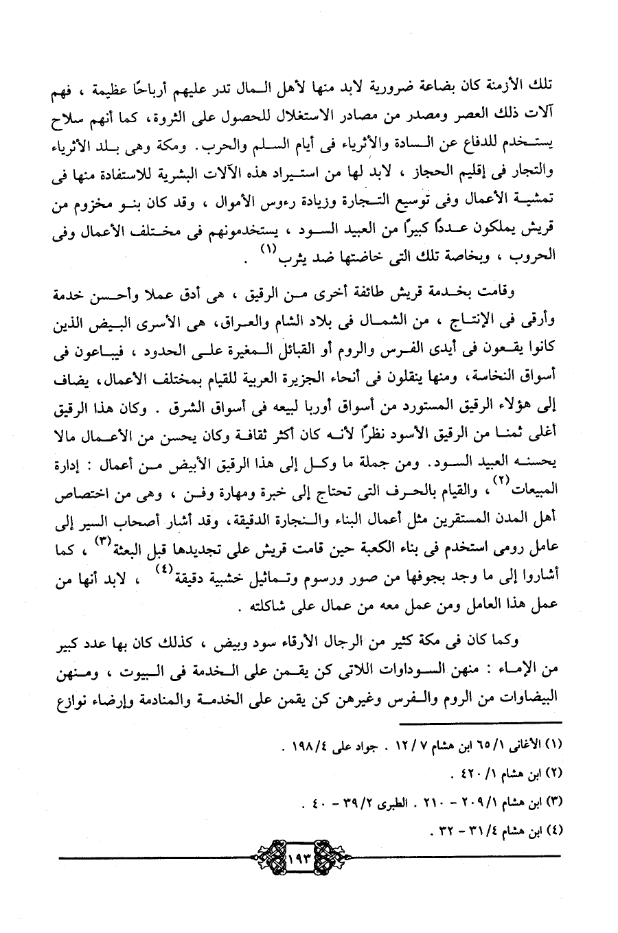 وقامت بخدمة قريش طائفة أخرى ممن الرقيق، هي أدق عملًا، وأحسن خدمة وأرقى في الإنتاج، من الشمال في بلاد الشام والعراق، هي الأسرى البيض الذين كانوا يقعون في أيدي الفرس والروم أو القبائل المغيرة على الحدود، فيباعون في أسواق النخاسة ومنها ينقلون في أنحاء الجزيرة العربية للقيام بمختلف الأعمال، يضاف إلى هؤلاء الرقيق المستورد من أسواق أوربا لبيعه في أسواق الشرق. وكان هذا الرقيق أغلى ثمنًا من الرقيق الأسود نظرًا لأنه كان أكثر ثقافة وكان يحسن من الأعمال ما لا يحسنه العبيد السود. ومن جملة ما وكل إلى هذا الرقيق الأبيض من أعمال: إدارة المبيعات2، والقيام بالحرف التي تحتاج إلى خبرة ومهارة وفن، وهي من اختصاص أهل المدن المستقرين مثل أعمال البناء والنجارة الدقيقة، وقد أشار أصحاب السير إلى عامل رومي استخدم في بناء الكعبة حين قامت قريش على تجديدها قبل البعثة3، كما أشاروا إلى ما وجد بجوفها من صور ورسوم وتماثيل خشبية دقيقة4، لا بد أنها من عمل هذا العامل ومَن عمل معه من عمال على شاكلته.