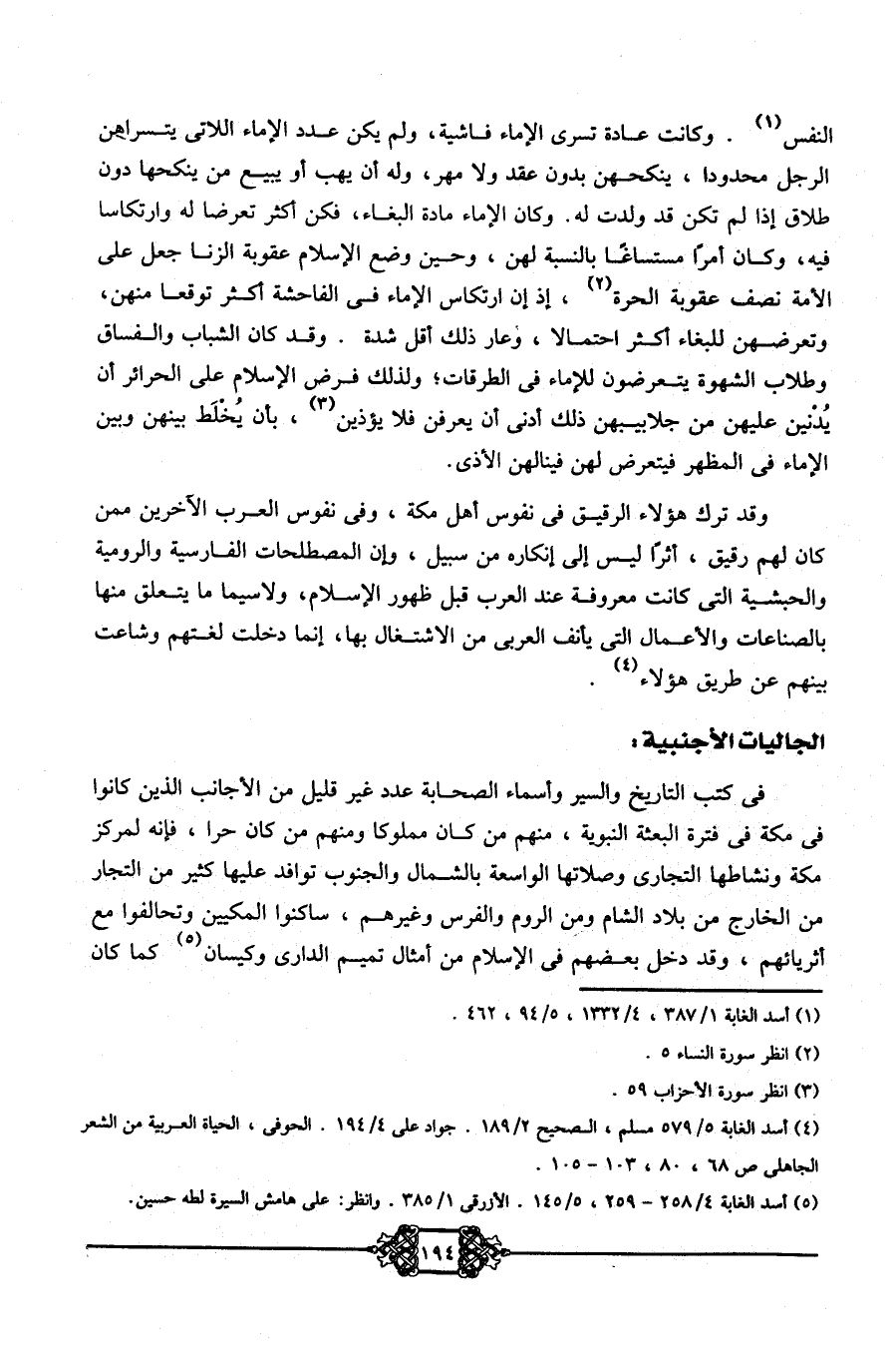 النفس 1. وكانت عادة تسري الإماء فاشية، ولم يكن عدد الإماء اللاتي يتسراهن الرجل محدودًا، ينكحهن بدون عقد ولا مهر، وله أن يهب أو يبيع من ينكحها دون طلاق إذا لم تكن قد ولدت له. وكان الإماء مادة البغاء، فكن أكثر تعرضًا له وارتكاسًا فيه، وكان أمرًا مستساغًا بالنسبة لهن، وحين وضع الإسلام عقوبة الزنا جعل على الأَمة نصف عقوبة الحرة2، إذ إن ارتكاس الإماء في الفاحشة أكثر توقعًا منهن، وتعرضهن للبغاء أكثر احتمالًا، وعارُ ذلك أقل شدة. وقد كان الشباب والفساق وطلاب الشهوة يتعرضون للإماء في الطرقات؛ ولذلك فرض الإسلام على الحرائر أن يدنين عليهن من جلابيبهن ذلك أدنى أن يعرفن فلا يؤذين3، بأن يخلط بينهن وبين الإماء في المظهر فيتعرض لهن فينالهن الأذى.