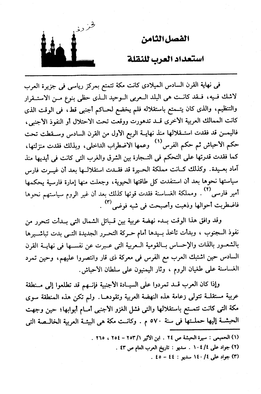 وإذا كان العرب قد تمردوا على السيادة الأجنبية؛ فإنهم قد تطلعوا إلى منطقة عربية مستقلة تتولى زعامة هذه النهضة العربية وتقودها. ولم تكن هذه المنطقة سوى مكة التي كانت تتمتع باستقلالها والتي فشل الغزو الأجنبي أمام أبوابها؛ حين وجهت الحبشة إليها حملتها في سنة 570م. وكانت مكة هي البيئة العربية الخالصة التي