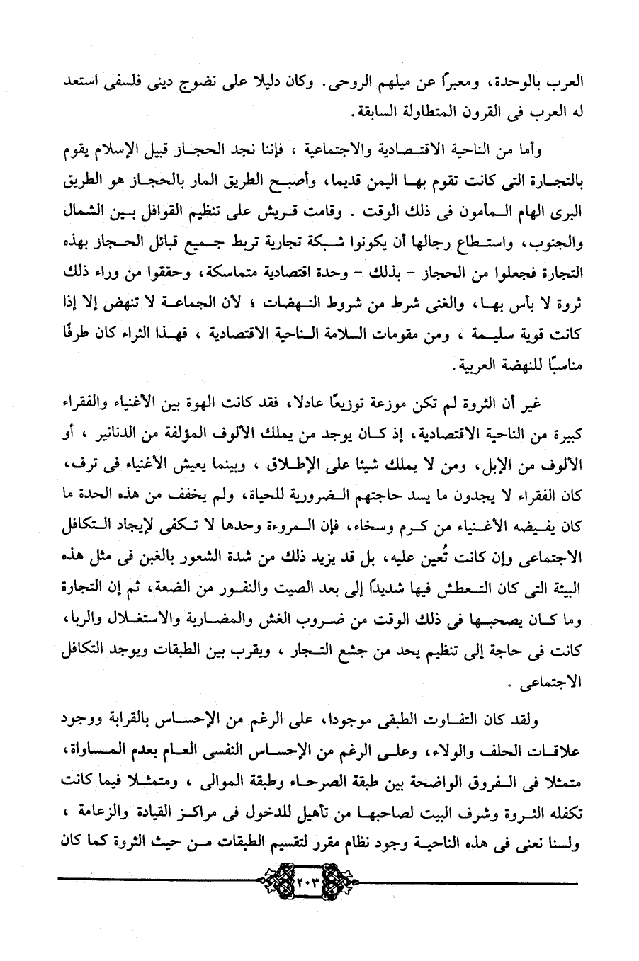 وأما من الناحية الاقتصادية والاجتماعية، فإننا نجد الحجاز قبيل الإسلام يقوم بالتجارة التي كانت تقوم بها اليمن قديمًا، وأصبح الطريق المار بالحجاز هو الطريق البري الهام المأمون في ذلك الوقت. وقامت قريش على تنظيم القوافل بين الشمال والجنوب, واستطاع رجالها أن يكونوا شبكة تجارية تربط جميع قبائل الحجاز بهذه التجارة فجعلوا من الحجاز -بذلك- وحدة اقتصادية متماسكة، وحققوا من وراء ذلك ثروة لا بأس بها، والغنى شرط من شروط النهضات؛ لأن الجماعة لا تنهض إلا إذا كانت قوية سليمة، ومن مقومات السلامة الناحية الاقتصادية, فهذا الثراء كان طرفًا مناسبًا للنهضة العربية.