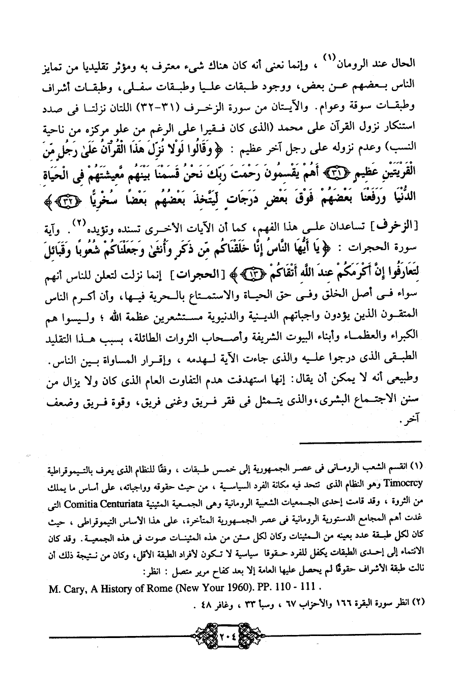 الحال عند الرومان 1؛ وإنما نعني أنه كان هناك شيء معترف به ومؤثر تقليدي من تمايز الناس بعضهم عن بضع, ووجود طبقات عليا وطبقات سفلى، وطبقات أشراف وطبقات سوقة وعوام. والآيتان من سورة الزخرف 31- 32 اللتان نزلتا في صدد استنكار نزول القرآن على محمد الذي كان فقيرًا على الرغم من علو مركزه من ناحية النسب وعدم نزوله على رجل آخر عظيم: {وَقَالُوا لَوْلا نُزِّلَ هَذَا الْقُرْآنُ عَلَى رَجُلٍ مِنَ الْقَرْيَتَيْنِ عَظِيمٍ، أَهُمْ يَقْسِمُونَ رَحْمَةَ رَبِّكَ نَحْنُ قَسَمْنَا بَيْنَهُمْ مَعِيشَتَهُمْ فِي الْحَيَاةِ الدُّنْيَا وَرَفَعْنَا بَعْضَهُمْ فَوْقَ بَعْضٍ دَرَجَاتٍ لِيَتَّخِذَ بَعْضُهُمْ بَعْضًا سُخْرِيًّّا} [الزخرف] تساعدان على هذا الفهم، كما أن الآيات الأخرى تسنده وتؤيده2. وآية سورة الحجرات: {يَا أَيُّهَا النَّاسُ إِنَّا خَلَقْنَاكُمْ مِنْ ذَكَرٍ وَأُنثَى وَجَعَلْنَاكُمْ شُعُوبًا وَقَبَائِلَ لِتَعَارَفُوا} [الحجرات] إنما نزلت لتعلن للناس أنهم سواء في أصل الخلق وفي حق الحياة والاستمتاع بالحرية فيها، وأن أكرم الناس المتقون الذين يؤدون واجباتهم الدينية والدنيوية مستشعرين عظمة الله؛ وليسوا هم الكبراء والعظماء وأبناء البيوت الشريفة وأصحاب الثروات الطائلة، بسبب هذا التقليد الطبقي الذي درجوا عليه والذي جاءت الآية لهدمه, وإقرار المساواة بين الناس. وطبيعي أنه لا يمكن أن يقال: إنها استهدفت هدم التفاوت العام الذي كان ولا يزال من سنن الاجتماع البشري، والذي يتمثل في فقر فريق وغنى فريق، وقوة فريق وضعف آخر.