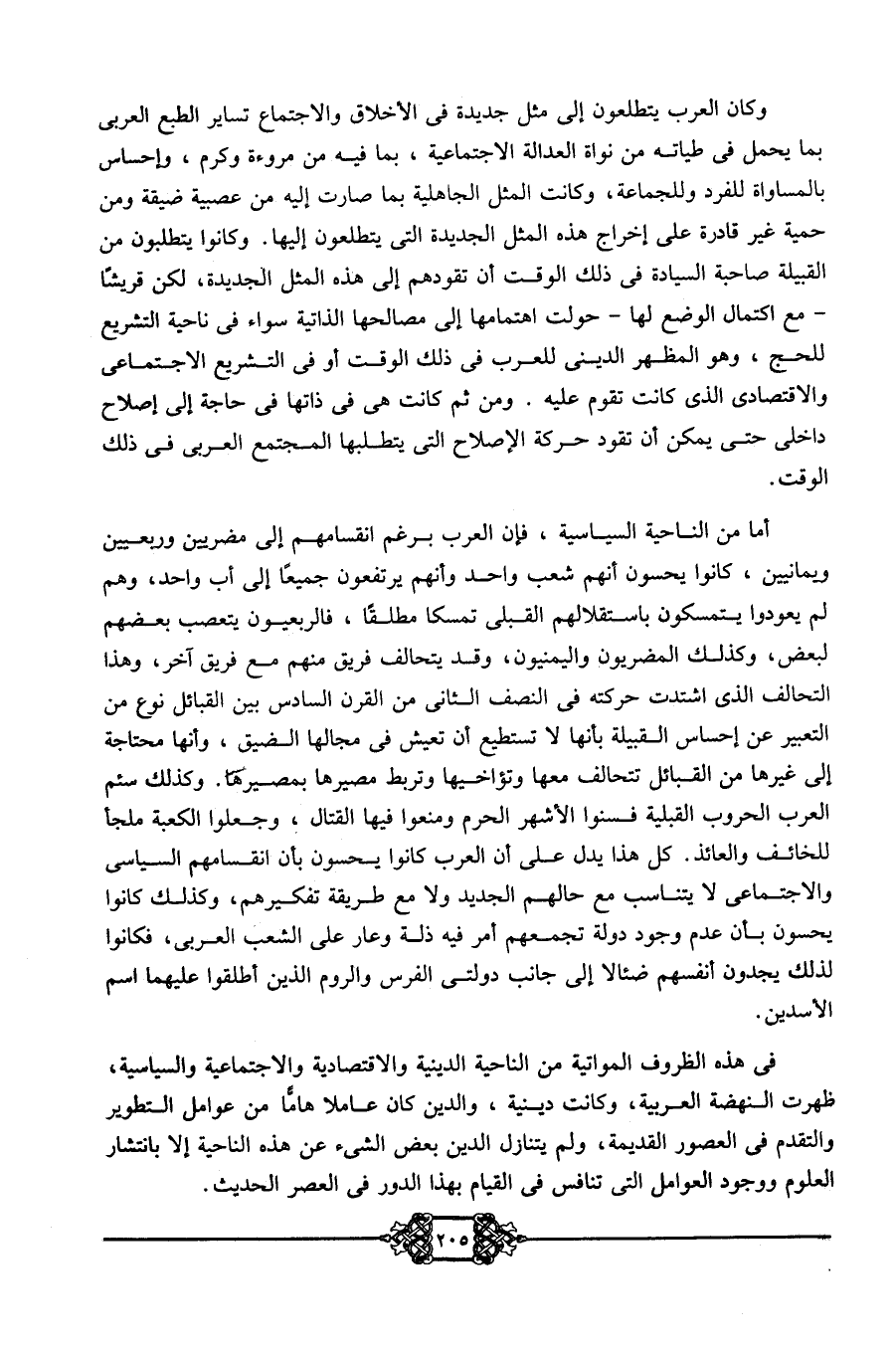 في هذه الظروف المواتية من الناحية الدينية والاقتصادية والاجتماعية والسياسية، ظهرت النهضة العربية، وكانت دينية، والدين كان عاملًا هامًّا من عوامل التطوير والتقدم في العصور القديمة، ولم يتنازل الدين بعض الشيء عن هذه الناحية إلا بانتشار العلوم ووجود العوامل التي تنافس في القيام بهذا الدور في العصر الحديث.