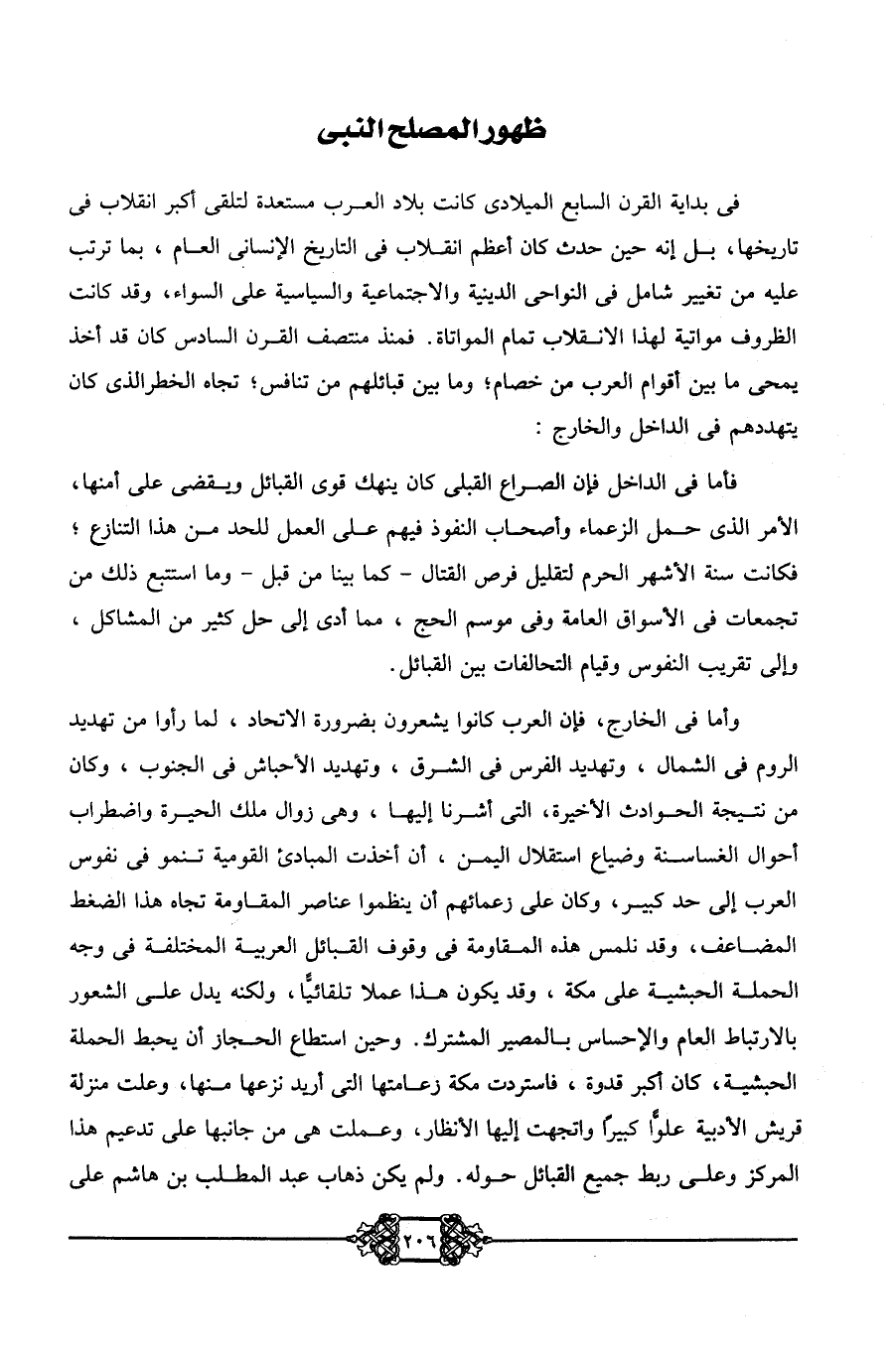 في بداية القرن السابع الميلادي كانت بلاد العرب مستعدة لتلقي أكبر انقلاب في تاريخها, بل إنه حين حدث كان أعظم انقلاب في التاريخ الإنساني العام، بما ترتب عليه من تغيير شامل في النواحي الدينية والاجتماعية والسياسية على السواء، وقد كانت الظروف مواتية لهذا الانقلاب تمام المواتاة. فمنذ منتصف القرن السادس كان قد أخذ يمحى ما بين أقوام العرب من خصام؛ وما بين قبائلهم من تنافس، تجاه الخطر الذي كان يتهددهم في الداخل والخارج:
