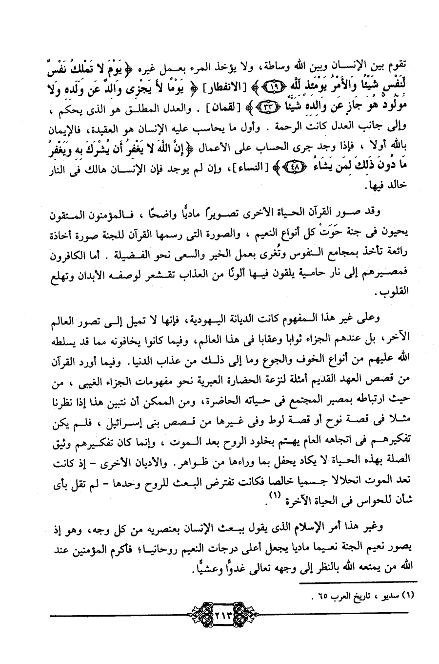 وغير هذا أمر الإسلام الذي يقول ببعث الإنسان بعنصريه من كل وجه، وهو إذ يصور نعيم الجنة نعيمًا ماديًّا يجعل أعلى درجات النعيم روحانيًّا؛ فأكرم المؤمنين عند الله من يمتعه الله بالنظر إلى وجهه تعالى غدوًّا وعشيًّا.