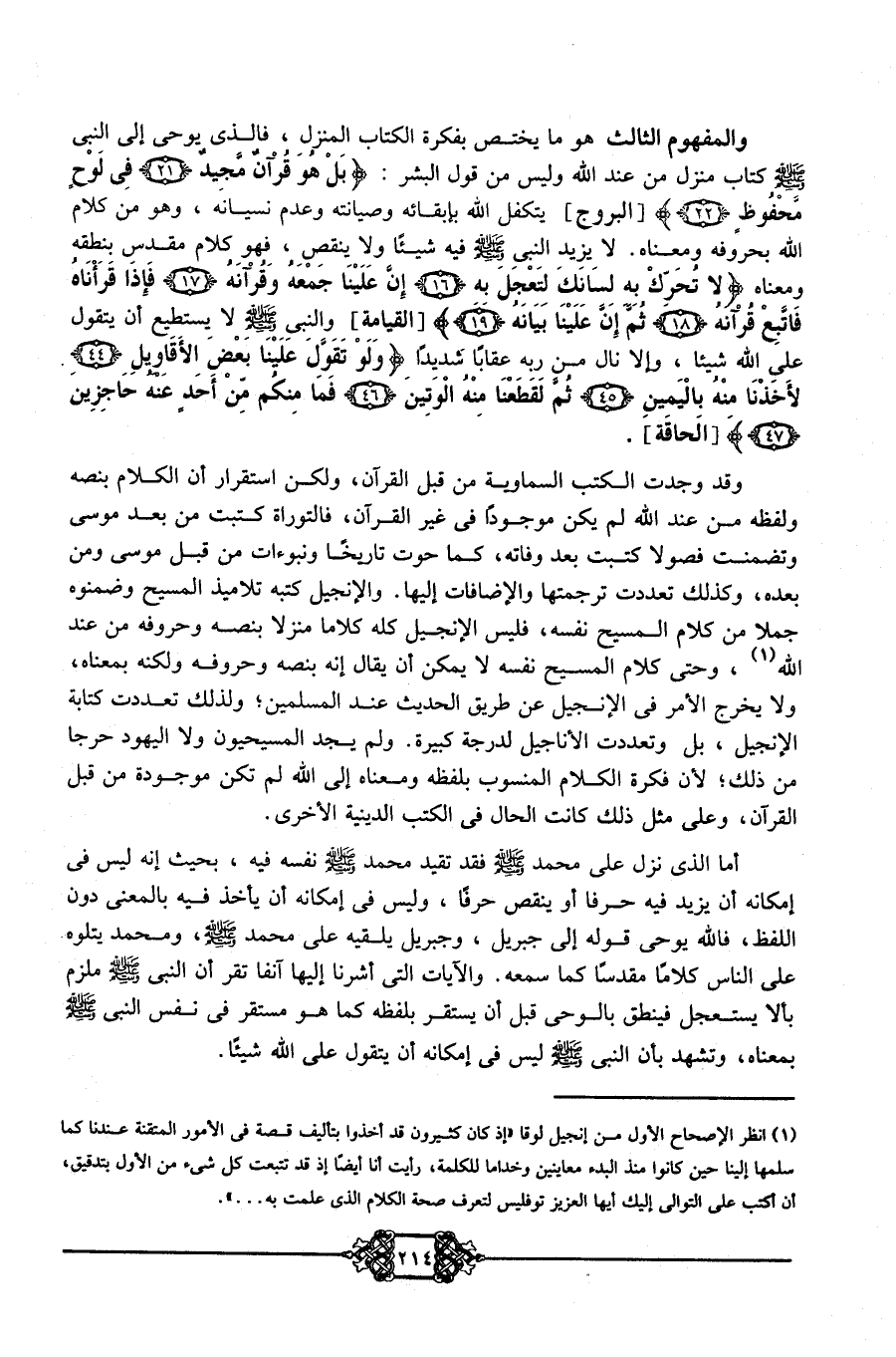 والمفهوم الثالث هو ما يختص بفكرة الكتاب المنزل، فالذي يوحى إلى النبي -صلى الله عليه وسلم- كتاب منزل من عند الله وليس من قول البشر: {بَلْ هُوَ قُرْآنٌ مَجِيدٌ، فِي لَوْحٍ مَحْفُوظٍ} [البروج] يتكفل الله ببقائه وصيانته وعدم نسيانه، وهو من كلام الله بحروفه ومعناه. لا يزيد النبي -صلى الله عليه وسلم- فيه شيئًا ولا ينقص، فهو كلام مقدس بنطقه ومعناه: {لا تُحَرِّكْ بِهِ لِسَانَكَ لِتَعْجَلَ بِهِ، إِنَّ عَلَيْنَا جَمْعَهُ وَقُرْآنَهُ، فَإِذَا قَرَأْنَاهُ فَاتَّبِعْ قُرْآنَهُ، ثُمَّ إِنَّ عَلَيْنَا بَيَانَهُ} [القيامة] والنبي -صلى الله عليه وسلم- لا يستطيع أن يتقول على الله شيئًا، وإلا نال من ربه عقابًا شديدًا: {وَلَوْ تَقَوَّلَ عَلَيْنَا بَعْضَ الأَقَاوِيلِ، لأَخَذْنَا مِنْهُ بِالْيَمِينِ، ثُمَّ لَقَطَعْنَا مِنْهُ الْوَتِينَ، فَمَا مِنْكُمْ مِنْ أَحَدٍ عَنْهُ حَاجِزِينَ} [الحاقة] .