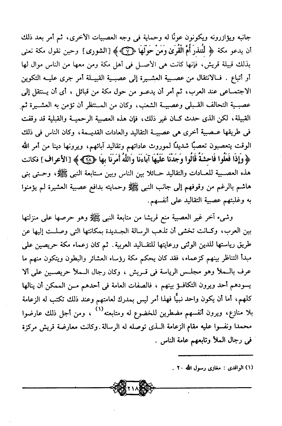 جانبه ويؤازرونه ويكونون عونًا له وحماية في وجه العصبيات الأخرى، ثم أمر بعد ذلك أن يدعو مكة {لِتُنْذِرَ أُمَّ الْقُرَى وَمَنْ حَوْلَهَا} [الشورى] وحين نقول مكة نعني بذلك قبيلة قريش؛ فإنها كانت هي الأصل في أهل مكة ومن معها من الناس موال لها أو أتباع. فالانتقال من عصبية العشيرة إلى عصيبة القبيلة أمر جرى عليه التكوين الاجتماعي عند العرب، ثم أمر أن يدعو من حول مكة من قبائل، أي أن ينتقل إلى عصبية التحالف القبلي وعصبية الشعب، وكان من المنتظر أن تؤمن به العشيرة ثم القبيلة، لكن الذي حدث كان غير ذلك، فإن هذه العصبية الرحمية والقبلية قد وقفت في طريقها عصبية أخرى هي عصبية التقاليد والعادات القديمة، وكان الناس في ذلك الوقت يتعصبون تعصبًا شديدًا لموروث عاداتهم وتقاليد آبائهم، ويرونها دينًا من أمر الله {وَإِذَا فَعَلُوا فَاحِشَةً قَالُوا وَجَدْنَا عَلَيْهَا آبَاءَنَا وَاللَّهُ أَمَرَنَا بِهَا} [الأعراف] فكانت هذه العصبية للعادات والتقاليد حائلًا بين الناس وبين متابعة النبي -صلى الله عليه وسلم- وحتى بني هاشم بالرغم من وقوفهم إلى جانب النبي -صلى الله عليه وسلم- وحمايته بدافع عصبية العشيرة لم يؤمنوا به وغلبتهم عصبية التقاليد على أنفسهم.
