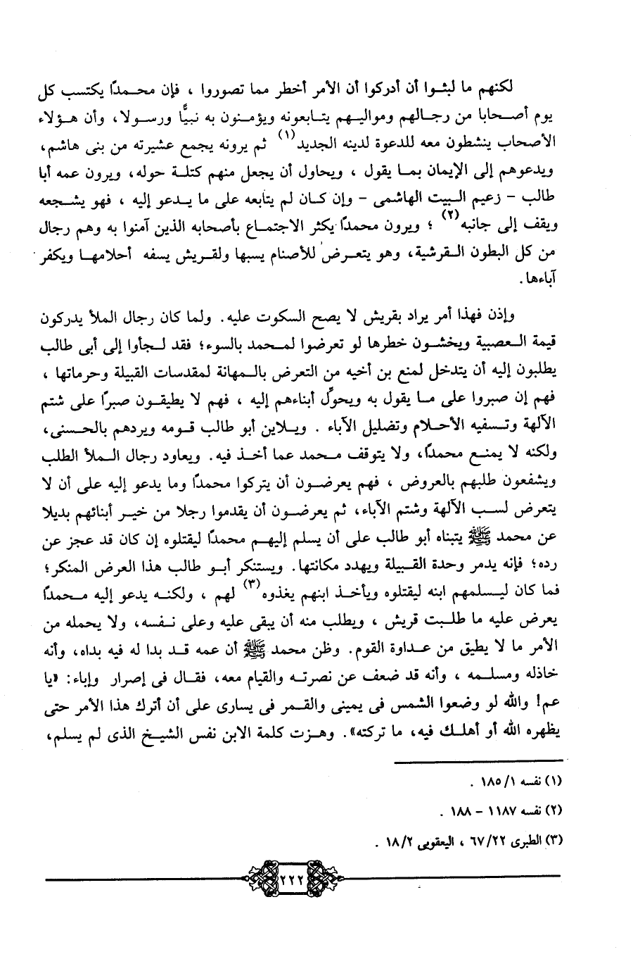 لكنهم ما لبثوا أن أدركوا أن الأمر أخطر مما تصوروا؛ فإن محمدًا يكتسب كل يوم أصحابًا من رجالهم ومواليهم يتابعونه ويؤمنون به نبيًّا ورسولًا، وأن هؤلاء الأصحاب ينشطون معه للدعوة لدينه الجديد1 ثم يرونه يجمع عشيرته من بني هاشم، ويدعوهم إلى الإيمان بما يقول، ويحاول أن يجعل منهم كتلة حوله، ويرون عمه أبا طالب -زعيم البيت الهاشمي- وإن كان لم يتابعه على ما يدعو إليه، فهو يشجعه ويقف إلى جانبه2؛ ويرون محمدًا يكثر الاجتماع بأصحابه الذين آمنوا به وهم رجال من كل بطون القرشية وهو يتعرض للأصنام يسبها ولقريش يسفه أحلامها ويكفر آباءها.