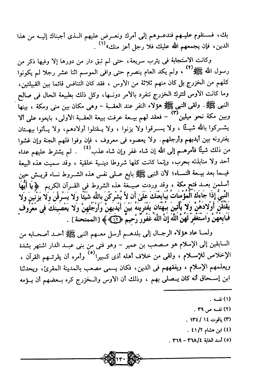 وكانت الاستجابة في يثرب سريعة، حتى لم تبق دار من دورها إلا وفيها ذكر من رسول الله -صلى الله عليه وسلم-2، ولم يكد العام ينصرم حتى وافى الموسم اثنا عشر رجلًا لم يكونوا كلهم من الخزرج بل كان منهم ثلاثة من الأوس، فقد كان التنافس قائمًا بين القبيلتين، وما كانت الأوس لتترك الخزرج تنفرد بالأمر دونها، وكل ذلك بطبيعة الحال في صالح النبي -صلى الله عليه وسلم. ولقي النبي -صلى الله عليه وسلم- هؤلاء النفر عند العقبة -وهي مكان بين منى ومكة، بينها وبين مكة نحو ميلين3- فعقد لهم بيعة عرفت بيعة العقبة الأولى، بايعوه على ألا يشركوا بالله شيئًا، ولا يسرقوا ولا يزنوا، ولا يقتلوا أولادهم، ولا يأتوا ببهتان يفترونه بين أيديهم وأرجلهم. ولا يعصوه في معروف؛ فإن وفوا فلهم الجنة وإن غشوا من ذلك شيئًا فأمرهم إلى الله إن شاء غفر وإن شاء عذب4. لم يشترط عليهم عداء أحد ولا منابذته بحرب؛ وإنما كانت كلها شروطًا دينية خلقية، وقد سميت هذه البيعة فيما بعد بيعة النساء؛ لأن النبي -صلى الله عليه وسلم- بايع على نفس هذه الشروط نساء قريش حين أسلمن بعد فتح مكة، وقد وردت صيغة هذه الشروط في القرآن الكريم {يَا أَيُّهَا النَّبِيُّ إِذَا جَاءَكَ الْمُؤْمِنَاتُ يُبَايِعْنَكَ عَلَى أَنْ لا يُشْرِكْنَ بِاللَّهِ شَيْئًا وَلا يَسْرِقْنَ وَلا يَزْنِينَ وَلا يَقْتُلْنَ أَوْلادَهُنَّ وَلا يَأْتِينَ بِبُهْتَانٍ يَفْتَرِينَهُ بَيْنَ أَيْدِيهِنَّ وَأَرْجُلِهِنَّ وَلا يَعْصِينَكَ فِي مَعْرُوفٍ فَبَايِعْهُنَّ وَاسْتَغْفِرْ لَهُنَّ اللَّهَ إِنَّ اللَّهَ غَفُورٌ رَحِيمٌ} [الممتحنة] .