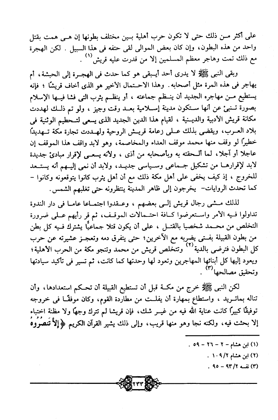 لذلك مشى رجال قريش إلى بعضهم، وعقدوا اجتماعًا عامًّا في دار الندوة وتداولوا فيه الأمر، واستعرضوا كافة احتمالات الموقف ثم قر رأيهم على ضرورة التخلص من محمد شخصيًّا بالقتل، على أن يكون قتلًا جماعيًّا يشترك فيه كل بطن من بطون القبيلة بفتى يضربه مع الآخرين؛ حتى يتفرق دمه وتعجز عشيرته عن حرب كل البطون فترضى بالدية2، وتتتخلص قريش من محمد وتنجو مكة من الحرب الأهلية؛ ويعود إليها كل أبنائها المهاجرين وتعود لها وحدتها كما كانت، ثم تسير في تأكيد سيادتها وتحقيق مصالحها3. لكن النبي -صلى الله عليه وسلم- خرج من مكة قبل أن تستطيع القبيلة أن تحكم استعدادها، وأن تناله بما تريد، واستطاع بمهارة أن يفلت من مطاردة القوم، وكان موفقًا في خروجه توفيقًا كبيرًا، كانت عناية الله فيه من غير شك، فإن قريشًالم تترك وجهًا ولا مظنة اختباء إلا بحثت فيه؛ ولكنه نجا وهو منها قريب وإلى ذلك يشير القرآن الكريم {إِلاَّ تَنصُرُوهُ