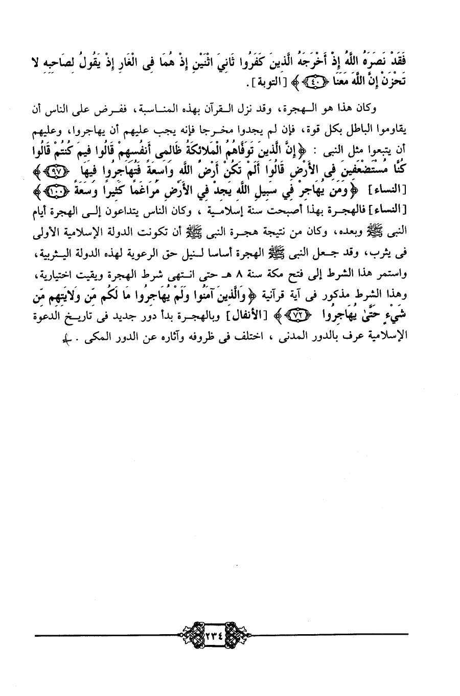 وكان هذا هو الهجرة، وقد نزل القرآن بهذه المناسبة، ففرض على الناس أن يقاوموا الباطل بكل قوة، فإن لم يجدوا مخرجًا؛ فإنه يجب عليهم أن يهاجروا، وعليهم أن يتبعوا مثل النبي: {إِنَّ الَّذِينَ تَوَفَّاهُمُ الْمَلائِكَةُ ظَالِمِي أَنفُسِهِمْ قَالُوا فِيمَ كُنتُمْ قَالُوا كُنَّا مُسْتَضْعَفِينَ فِي الأَرْضِ قَالُوا أَلَمْ تَكُنْ أَرْضُ اللَّهِ وَاسِعَةً فَتُهَاجِرُوا فِيهَا} [النساء] {وَمَنْ يُهَاجِرْ فِي سَبِيلِ اللَّهِ يَجِدْ فِي الأَرْضِ مُرَاغَمًا كَثِيرًا وَسَعَةً} [النساء] . فالهجرة بهذا أصحبت سنة إسلامية، وكان الناس يتداعون إلى الهجرة أيام النبي -صلى الله عليه وسلم- وبعده، وكانت من نتيجة هجرة النبي -صلى الله عليه وسلم- أن تكونت الدولة الإسلامية الأولى في يثرب، وقد جعل النبي -صلى الله عليه وسلم- الهجرة أساسًا لنيل حق الرعوية لهذه الدولة اليثربية، واستمر هذا الشرط إلى فتح مكة سنة 8هـ حتى انتهى شرط الهجرة وبقيت اختيارية، وهذا الشرط مذكور في آية قرآنية {وَالَّذِينَ آمَنُوا وَلَمْ يُهَاجرُوا مَا لَكُمْ مِنْ وَلايَتِهِمْ مِنْ شَيْءٍ حَتَّى يُهَاجِرُوا} [الأنفال] وبالهجرة بدأ دور جديد في تاريخ الدعوة الإسلامية عرف بالدور المدني، اختلف في ظروفه وآثاره عن الدور المكي.