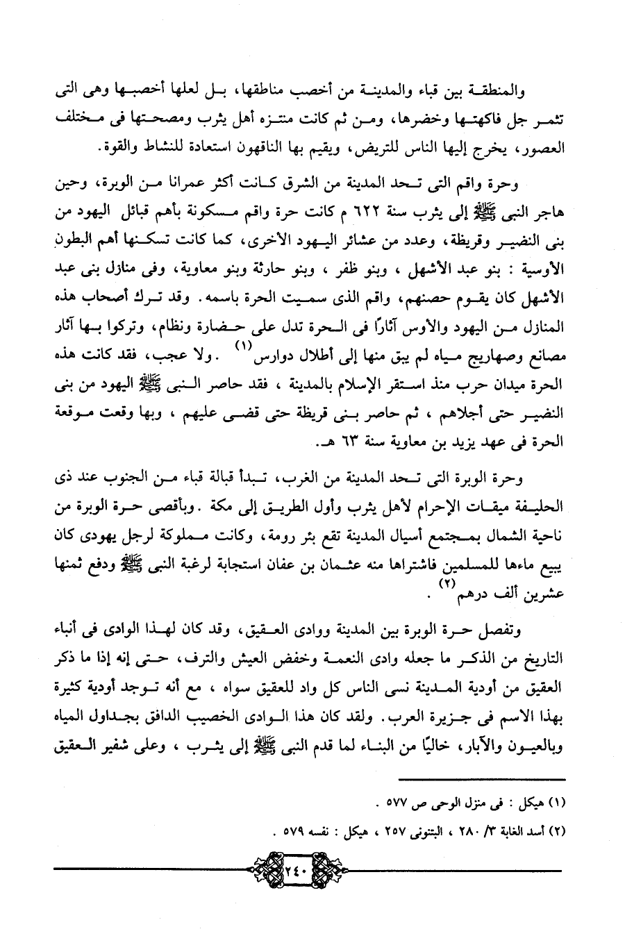 وحرة واقم التي تحد المدينة من الشرق كانت أكثر عمرانًا من الوبرة، وحين هاجر النبي -صلى الله عليه وسلم- إلى يثرب سنة 622 م كانت حرة واقم مسكونة بأهم قبائل اليهود من بني النضير وقريظة، وعدد من عشائر اليهود الأخرى، كما كانت تسكنها أهم البطون الأوسية: بنو عبد الأشهل، وبنو ظفر، وبنو حارثة، وبنو معاوية، وفي منازل بني عبد الأشهل كان يقوم حصنهم واقم الذي سميت الحرة باسمه. وقد ترك أصحاب هذه المنازل من اليهود والأوس آثارًا في الحرة تدل على حضارة ونظام، وتركوا بها آثار مصانع وصهاريج مياه لم يبق منها إلا أطلال دوارس 1، ولا عجب، فقد كانت هذه الحرة ميدانًا حرب منذ استقر الإسلام بالمدينة؛ فقد حاصر النبي -صلى الله عليه وسلم- اليهود من بني النضير حتى أجلاهم، ثم حاصر بني قريظة حتى قضى عليهم، وبها وقعت موقعة الحرة في عهد يزيد بن معاوية سنة 63هـ.