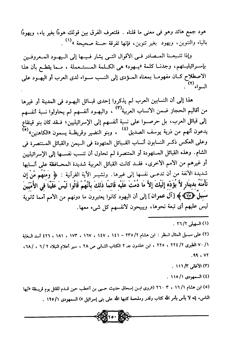 وإذا تتبعن المصادر في الأقوال التي يشار فيها إلى اليهود المعروفين بإسرائيليتهم؛ وجدنا كلمة يهود هي الكلمة المستعملة، مما يقطع بأن هذا الاصطلاح كان مفهومًا بمعناه المؤدي إلى النسب سواء لدى العرب أو اليهود على السواء2.