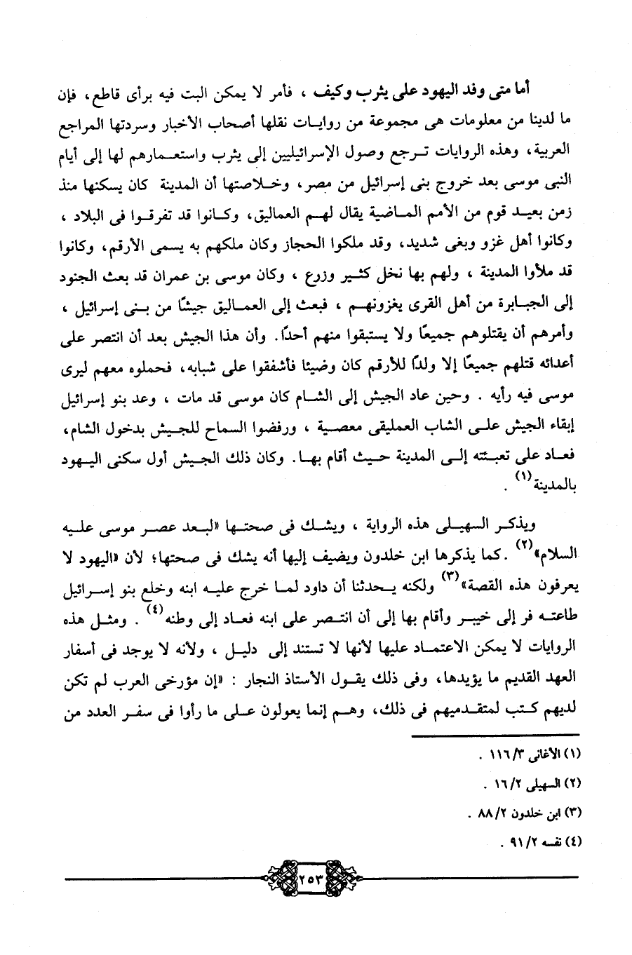 ويذكر السهيلي هذه الرواية، ويشك في صحتها لبعد عصر موسى -عليه السلام-2. كما يذكرها ابن خلدون ويضيف إليها أنه يشك في صحتها؛ لأن اليهود لا يعرفون هذه القصة3؛ ولكنه يحدثنا أن دواد لما خرج عليه ابنه وخلع بنو إسرائيل طاعته فر إلى خيبر وأقام بها إلى أن انتصر على ابنه فعاد إلى وطنه4. ومثل هذه الروايات لا يمكن الاعتماد عليها؛ لأنها لا تستند إلى دليل، ولأنه لا يوجد في أسفار العهد القديم ما يؤيدها، وفي ذلك يقول الأستاذ النجار: إن مؤرخي العرب لم تكن لديهم كتب لمتقدميهم في ذلك، وهم إنما يعولون على ما رأوا في سفر العدد من