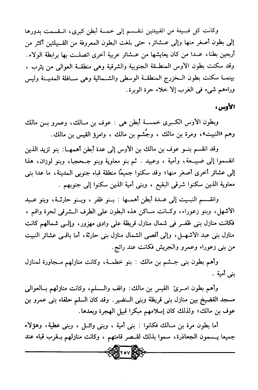 وقد انقسم بنو عوف بن مالك بن الأوس إلى عدة أبطن أهمها: بنو تزيد الذين انقمسوا إلى ضبيعة، وأمية، وعبيد. ثم بنو معاوية، وبنو جحجبا، وبنو لوزان، هذا إلى عشائر أخرى أصغر منها، وقد سكنوا جميعًا منطقة قباء جنوبي المدينة، ما عدا بني معاوية الذين سكنوا شرقي البقيع، وبني أمية الذين سكنوا إلى جنوبهم.