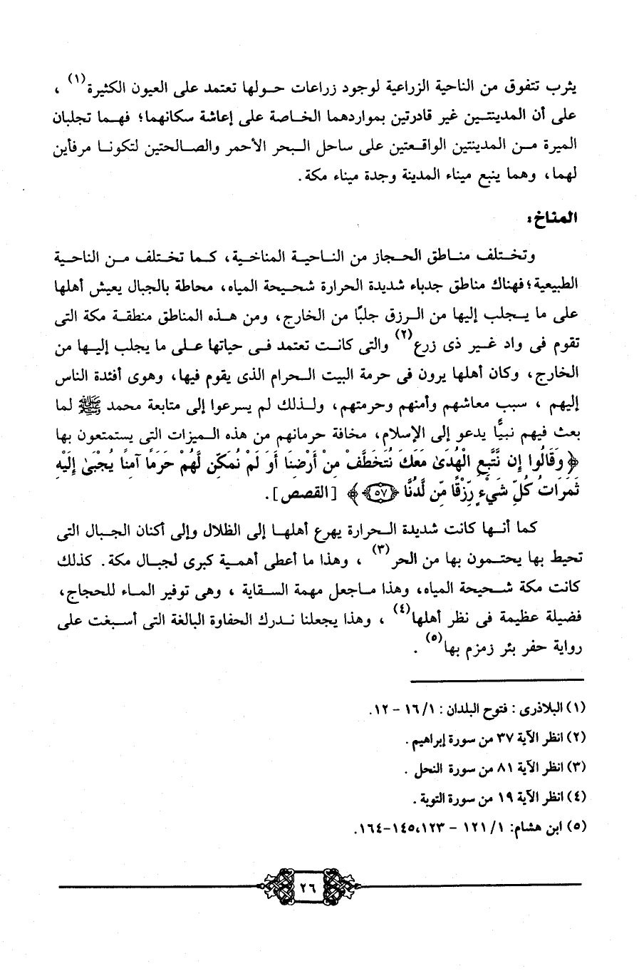 وتختلف مناطق الحجاز من الناحية المناخية، كما تختلف من الناحية الطبيعية؛ فهناك مناطق جدباء شديدة الحرارة شحيحة المياه، محاطة بالجبال يعيش أهلها على ما يجلب إليها من الرزق جلبًا من الخارج، ومن هذه المناطق منطقة مكة التي تقوم في واد غير ذي زرع1 والتي كانت تعتمد في حياتها على ما يجلب إليها من الخارج، وكان أهلها يرون في حرمة البيت الحرام الذي يقوم فيها، وهوى أفئدة الناس إليهم، سبب معاشهم وأمنهم وحرمتهم؛ ولذلك لم يسرعوا إلى متابعة محمد -صلى الله عليه وسلم- لما بعث فيهم نبيًّا يدعو إلى الإسلام، مخافة حرمانهم من هذه الميزات التي يستمتعون بها {وَقَالُوا إِنْ نَتَّبِعِ الْهُدَى مَعَكَ نُتَخَطَّفْ مِنْ أَرْضِنَا أَوَلَمْ نُمَكِّنْ لَهُمْ حَرَمًا آمِنًا يُجْبَى إِلَيْهِ ثَمَرَاتُ كُلِّ شَيْءٍ رِزْقًا مِنْ لَدُنَّا} [القصص] .