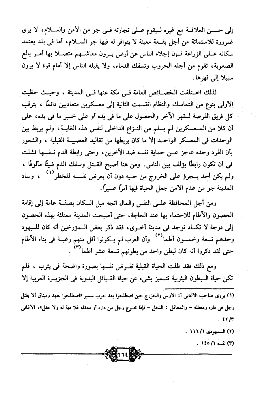 لذلك اختلفت الخصائص العامة في مكة عنها في المدينة، وحيث حظيت الأولى بنوع من التماسك والنظام، وانقسمت الثانية إلى معسكرين متعاديين دائمًا، يترقب كل فريق الفرصة لقهر الآخر والحصول على ما في يده أو على خير ما في يده، على أن كلًا من المعسكرين لم يسلم من النزاع الداخلي لنفس هذه الغاية، ولم يربط بين الوحدات في المعسكر الواحد إلا ما كان يربطها من تقاليد العصبية القبلية، والشعور بأن الفرد وحده عاجز عن حماية نفسه ضد الآخرين، وحتى رابطة الدم نفسها فشلت في أن تكون رابطًا يؤلف بين الناس. ومن هنا أصبح القتل وسفك الدم شيئًا مألوفًا، ولم يكن أحد يجرؤ على الخروج من حيه دون أن يعرض نفسه للخطر1، وساد المدينة جو من عدم الأمن جعل الحياة فيها أمرًا عسيرًا.