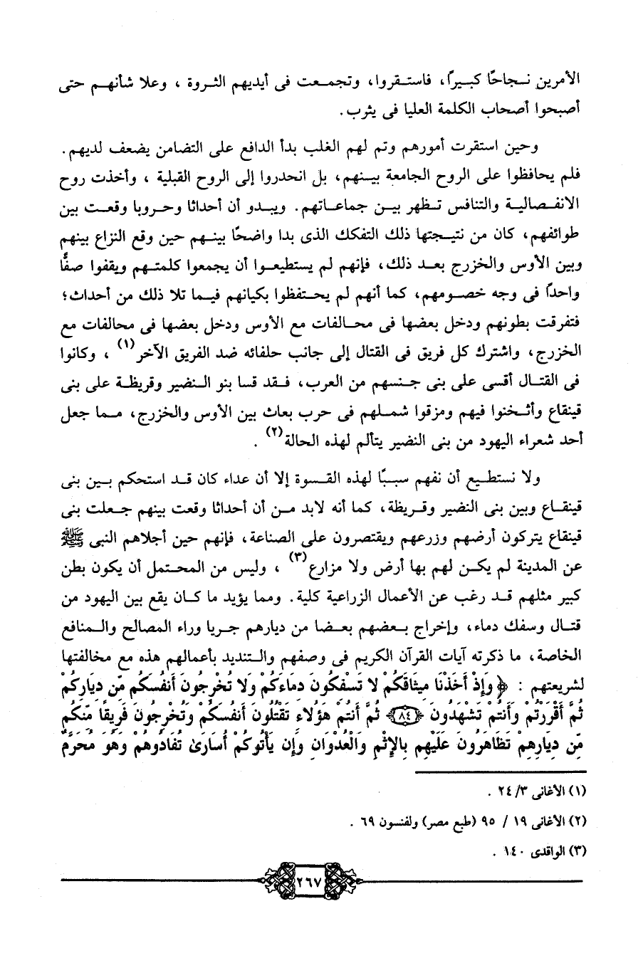 ولا نستطيع أن نفهم سببًا لهذه القسوة إلا أن عداء كان قد استحكم بين بني قينقاع وبين بني النضير وقريظة، كما أنه لا بد من أن أحداثًا وقعت بينهم، جعلت بني قينقاع يتركون أرضهم وزرعهم ويقتصرون على الصناعة؛ فإنهم حين أجلاهم النبي - صلى الله عليه وسلم- عن المدينة لم يكن لهم بها أرض ولا مزارع3، وليس من المحتمل أن يكون بطن كبير مثلهم قد رغب عن الأعمال الزراعية كلية. ومما يؤيد ما كان يقع بين اليهود من قتال وسفك دماء، وإخراج بعضهم بعضًا من ديارهم جريًّا وراء المصالح والمنافع الخاصة، ما ذكرته آيات القرآن الكريم في وصفهم والتنديد بأعمالهم هذه مع مخالفتها لشريعتهم {وَإِذْ أَخَذْنَا مِيثَاقَكُمْ لا تَسْفِكُونَ دِمَاءَكُمْ وَلا تُخْرِجُونَ أَنفُسَكُمْ مِنْ دِيَارِكُمْ ثُمَّ أَقْرَرْتُمْ وَأَنْتُمْ تَشْهَدُونَ، ثُمَّ أَنْتُمْ هَؤُلاء تَقْتُلُونَ أَنفُسَكُمْ وَتُخْرِجُونَ فَرِيقًا مِنْكُمْ مِنْ دِيَارِهِمْ تَظَاهَرُونَ عَلَيْهِمْ بِالإِثْمِ وَالْعُدْوَانِ وَإِنْ يَأْتُوكُمْ أُسَارَى تُفَادُوهُمْ وَهُوَ مُحَرَّمٌ