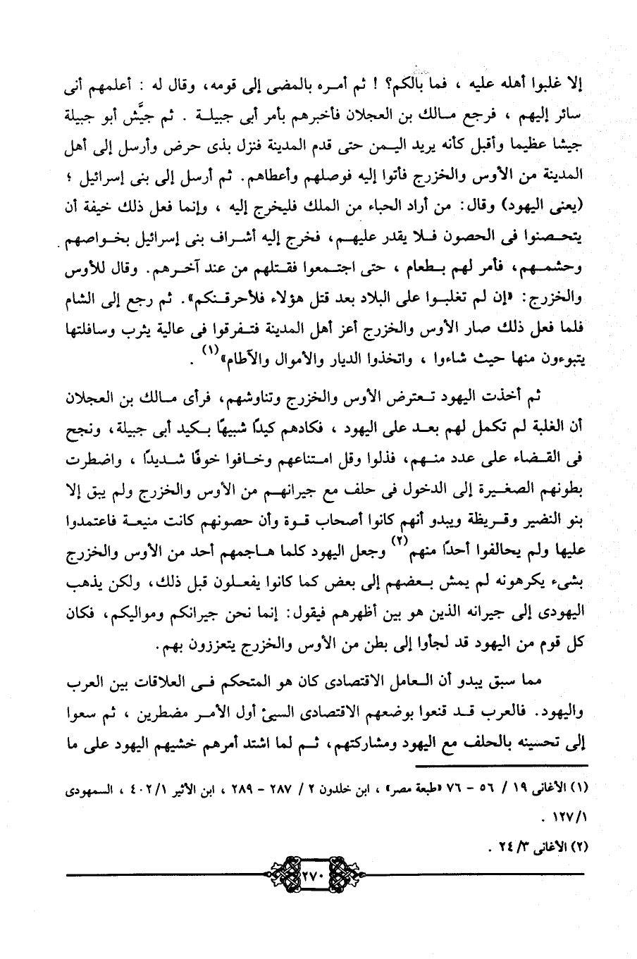 مما سبق يبدو أن العامل الاقتصادي كان هو المتحكم في العلاقات بين العرب واليهود. فالعرب قد قنعوا بوضعهم الاقتصادي السيئ أول الأمر مضطرين، ثم سعوا إلى تحسينه بالحلف مع اليهود ومشاركتهم، ثم لما اشتد أمرهم خشيهم اليهود على ما
