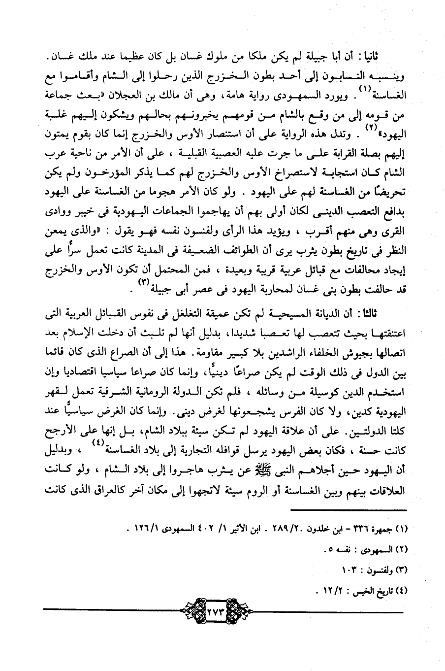 ثالثًا: أن الديانة المسيحية لم تكن عميقة التغلغل في نفوس القبائل العربية التي اعتنقتها بحيث تتعصب لها تعصبًا شديدًا، بدليل أنها لم تلبث أن دخلت الإسلام بعد اتصالها بجيوش الخلفاء الراشدين بلا كبير مقاومة. هذا إلى أن الصراع الذي كان قائمًا بين الدول في ذلك الوقت لم يكن صراعًا دينيًّا؛ وإنما كان صراعًا سياسيًّا اقتصاديًّا وإن استخدم الدين كوسيلة من وسائله، فلم تكن الدولة الرومانية الشرقية تعمل لقهر اليهودية كدين، ولا كان الفرس يشجعونها لغرض ديني. وإنما كان الغرض سياسيًّا عند كلتا الدولتين. على أن علاقة اليهود لم تكن سيئة ببلاد الشام، بل إنها على الأرجح كانت حسنة، فكان بعض اليهود يرسل قوافله التجارية إلى بلاد الغساسنة4، وبدليل أن اليهود حين أجلاهم النبي -صلى الله عليه وسلم- عن يثرب هاجروا إلى بلاد الشام، ولو كانت العلاقات بينهم وبين الغساسنة أو الروم سيئة لاتجهوا إلى مكان آخر كالعراق الذي كانت
