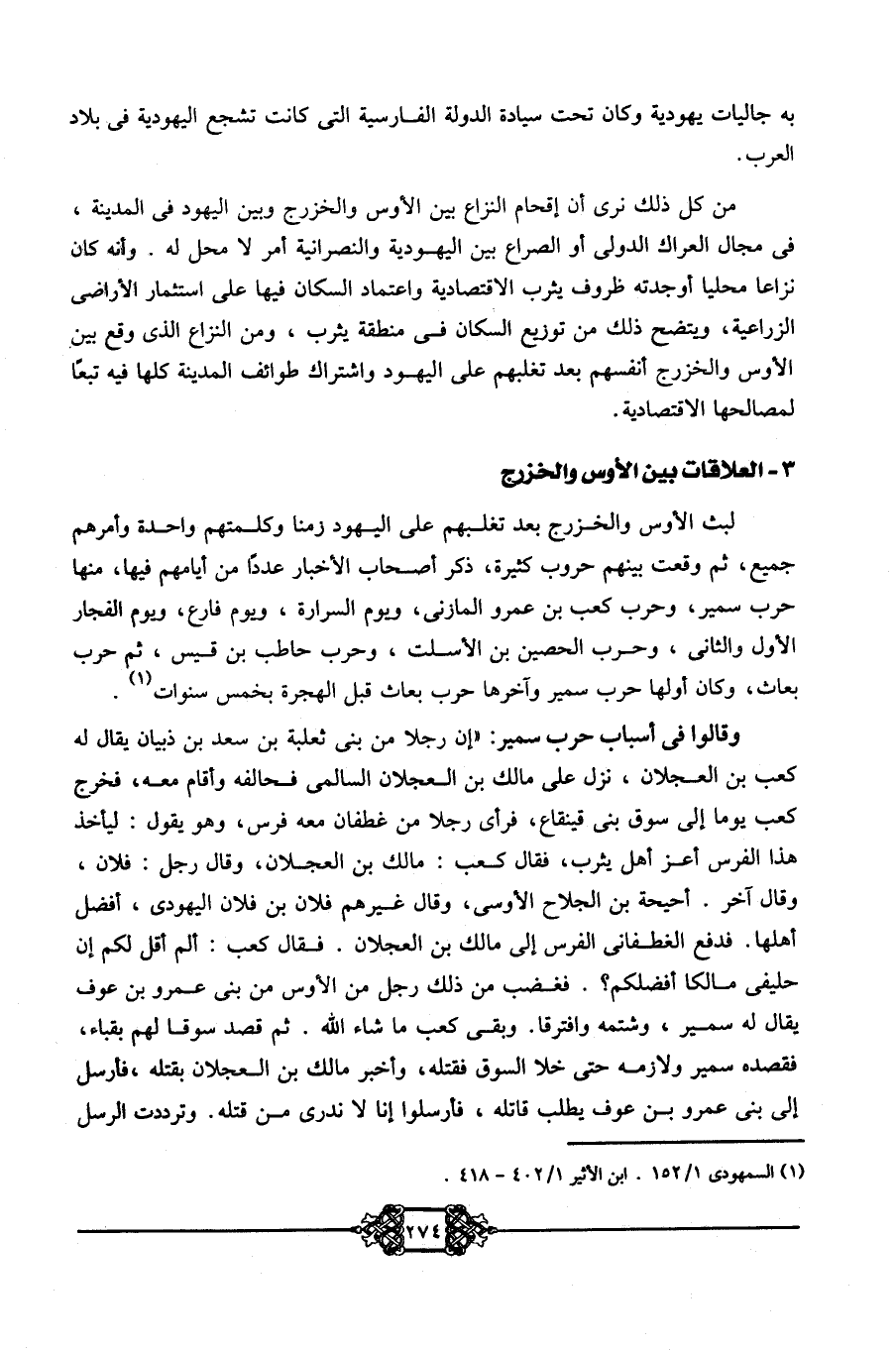 من كل ذلك نرى أن إقحام النزاع بين الأوس والخزرج وبين اليهود في المدينة في مجال العراك الدولي أو الصراع بين اليهودية والنصرانية أمر لا محل له. وأنه كان نزاعًا محليًّا أوجدته ظروف يثرب الاقتصادية واعتماد السكان فيها على استثمار الأراضي الزراعية، ويتضح ذلك من توزيع السكان في منطقة يثرب، ومن النزاع الذي وقع بين الأوس والخزرج أنفسهم بعد تغلبهم على اليهود واشتراك طوائف المدينة كلها فيه تبعًا لمصالحها الاقتصادية.