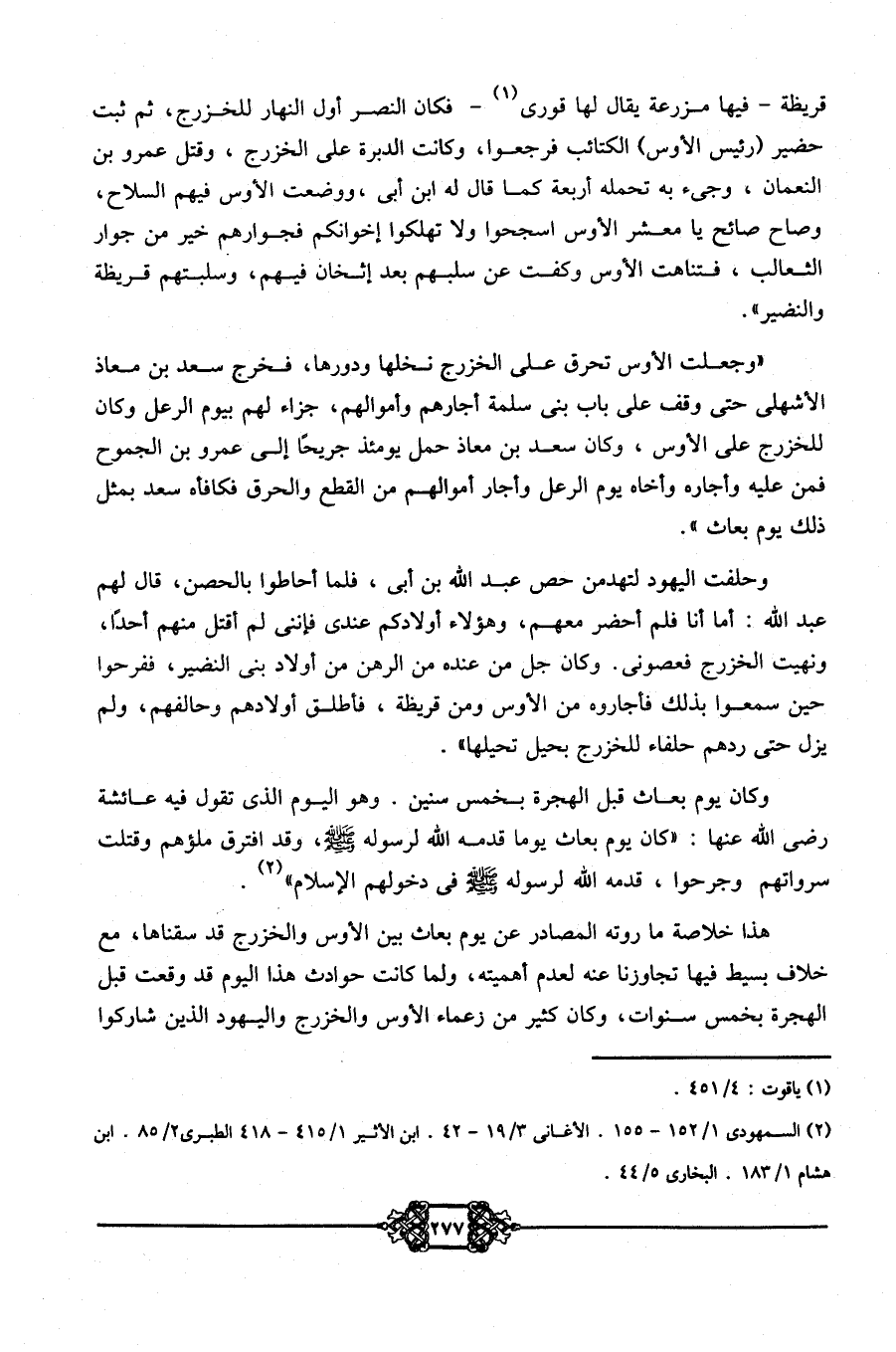قريظة- فيها مرزعة يقال لها قورى1 فكان النصر أول النهار للخزرج، ثم ثبت حضير -رئيس الأوس- الكتائب فرجعوا، وكانت الدبرة على الخزرج، وقتل عمرو بن النعمان وجيء به تحمله أربعة كما قال له ابن أبي، ووضعت الأوس فيهم السلاح، وصاح صائح: يا معشر الأوس اسجحوا ولا تهلكوا إخوانكم فجوارهم خير من جوار الثعالب، فتناهت الأوس وكفت عن سلبهم بعد إثخان فيهم، وسلبتهم قريظة والنضير.
