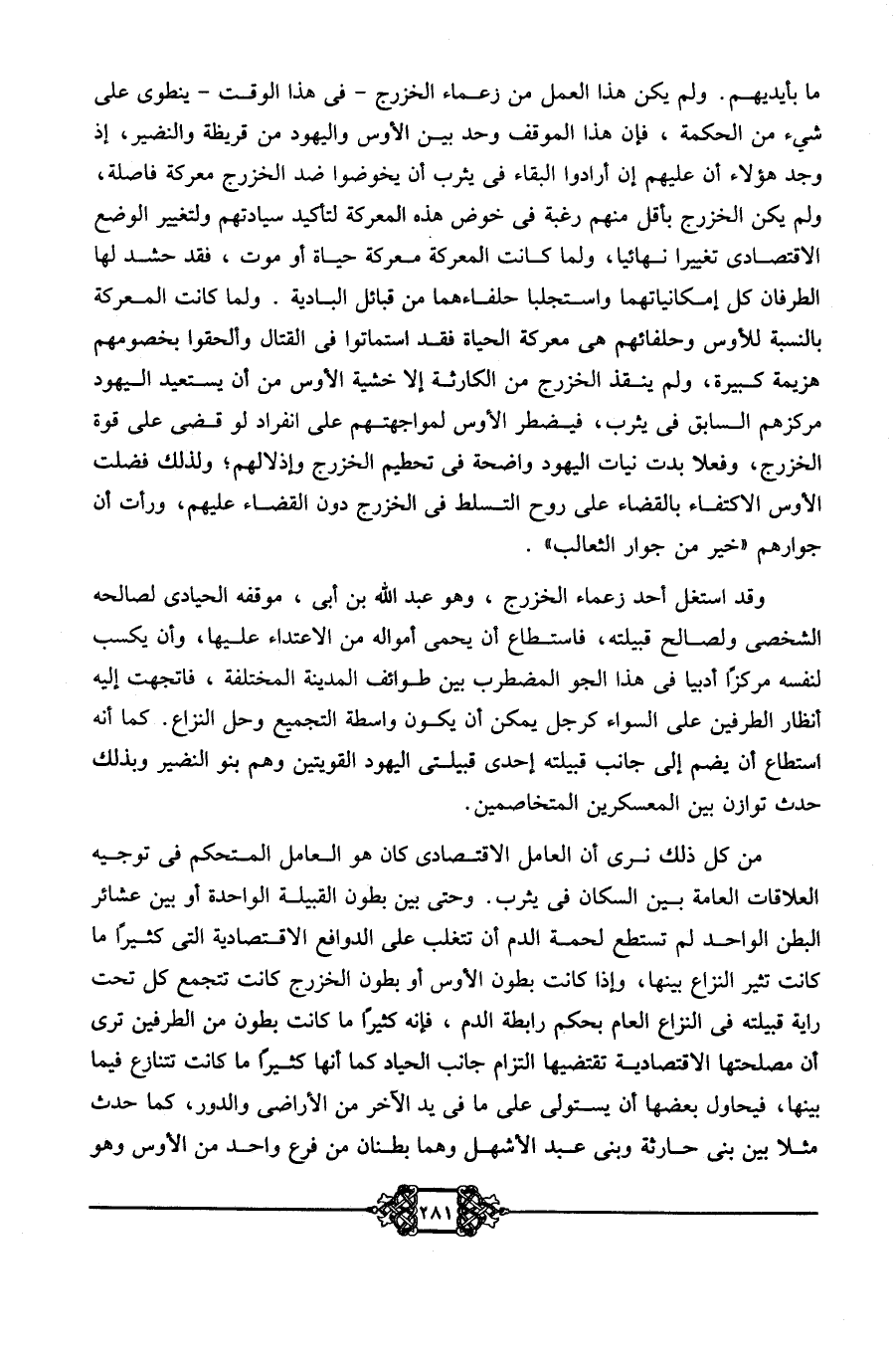 من كل ذلك نرى أن العامل الاقتصادي كان هو العامل المتحكم في العلاقات العامة بين السكان في يثرب. وحتى بين بطون القبيلة الواحدة أو بين عشائر البطن الواحدلم تستطع لحمة الدم أن تتغلب على الدوافع الاقتصادية التي كثيرًا ما كانت تثير النزاع بينها، وإذا كانت بطون الأوس أو بطون الخزرج كانت تتجمع تحت راية قبيلته في النزاع العام بحكم رابطة الدم، فإن كثيرًا ما كانت بطون من الطرفين ترى أن مصلحتها الاقتصادية تقتضيها التزام جانب الحياد، كما أنها كثيرًا ما كانت تتنازع فيما بينها فيحاول بعضها أن يستولي على ما في يد الآخر من الأراضي والدور، كما حدث مثلًا بين بني حارثة وبني عبد الأشهل وهما بطنان من فرع واحد من الأوس وهو