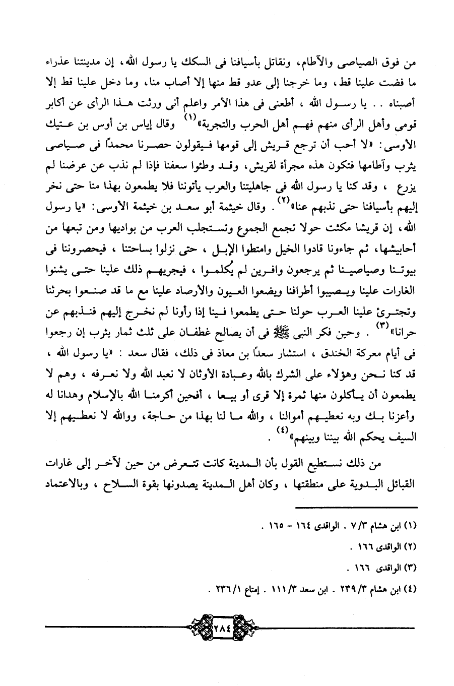 من فوق الصياصي والآطام، ونقاتل بأسيافنا في السكك يا رسول الله، إن مدينتنا عذارء ما فضت علينا قط، وما خرجنا إلى عدو قط إلا ما أصاب منا، وما دخل علينا قط إلا أصبناه ... يا رسول الله، أطعني في هذا الأمر، واعلم أني ورثت هذا الرأي عن أكابر قومي وأهل الرأي منهم فهم أهل الحرب والتجربة1، وقال إياس بن أوس بن عتيك الأوسي: لا أحب أن ترجع قريش إلى قومها فيقولون حصرنا محمدًا في صياصي يثرب وآطامها فتكون هذه مجرأة لقريش، وقد وطئوا سعفنا؛ فإذا لم نذب عن عرضنا لم يزرع، وقد كنا يا رسول الله -صلى الله عليه وسلم- في جاهليتنا والعرب يأتوننا فلا يطمعون بهذا منا حتى نخر إليهم بأسيافنا حتى نذبهم عنا2. وقال خيثمة أبو سعد بن خيثمة الأوسي: يا رسول الله، إن قريشًا مكثت حولًا تجمع الجموع وتستجلب العرب من بواديها ومن تبعها من أحابيشها، ثم جاءونا قادوا الخيل وامتطوا الإبل، حتى نزلوا بساحتنا، فيحصروننا في بيوتنا وصياصينا، ثم يرجعون وافرين لم يكلموا، فيجريهم ذلك علينا حتى يشنوا الغارات علينا ويصيبوا أطرافنا ويضعوا العيون والأرصاد علينا مع ما قد صنعوا بحرثنا، وتجترئ علينا العرب حولنا حتى يطمعوا فينا إذا رأونا لم نخرج إليهم فنذبهم عن حرانا3. وحين فكر النبي -صلى الله عليه وسلم- في أن يصالح غطفان على ثلث ثمار يثرب إن رجعوا قد كنا نحن وهؤلاء على الشرك بالله وعبادة الأوثان لا نعبد الله ولا نعرفه، وهم لا يطمعون أن يأكلوا منها ثمرة إلا قرى أو بيعًا، أفحين أكرمنا الله بالإسلام وهدانا له وأعزنا بك وبه نعطيهم أموالنا، والله ما لنا بهذا من حاجة، ووالله لا نعطيهم إلا السيف يحكم الله بيننا وبينهم4.