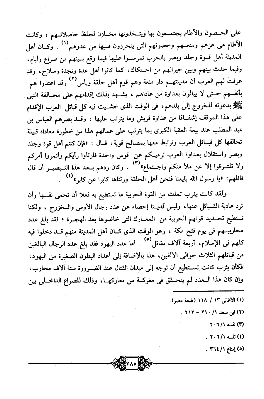 على الحصون والآطام يجتمعون بها ويتخذونها مخازن لحفظ حاصلاتهم، وكانت الآطام هي عزهم ومنعهم وحصونهم التي يتحرزون فيها من عدوهم1. وكان أهل المدينة أهل قوة وجلد وبصر بالحرب، تمرسوا عليها فيما وقع بينهم من صراع وأيام، وفيما حدث بينهم وبين جيرانهم من احتكاك، كما كانوا أهل عدة ونجدة وسلاح، وقد عرفت لهم العرب أن مدينتهم دار منعة وهم قوم أهل حلقة وبأس2، وقد اعتدوا بأنفسهم حتى لا يبالون بعداوة من عاداهم، يشهد بذلك إقدامهم على مخالفة النبي -صلى الله عليه وسلم- بدعوته للخروج إلى بلدهم، في الوقت الذي خشيت فيه كل قبائل العرب الإقدام على هذا الموقف إشفاقًا من عداوة قريش وما يترتب عليها، وقد بصرهم العباس بن عبد المطلب عند بيعة العقبة الكبرى بما يترتب على عملهم هذا من خطورة معاداة قبيلة تحالفها كل قبائل العرب وترتبط معها بمصالح قوية قال: فإن كنتم أهل قوة وجلد وبصر واستقلال بعداوة العرب ترميكم عن قوس واحدة فارتأوا رأيكم وأتمروا أمركم ولا تفترقوا إلا عن ملأ منكم واجتماع3. وكان ردهم بعد هذا التبصير أن قال قائلهم: يا رسول الله، بايعنا فنحن أهل الحلقة ورثناها كابرًا عن كابر4.