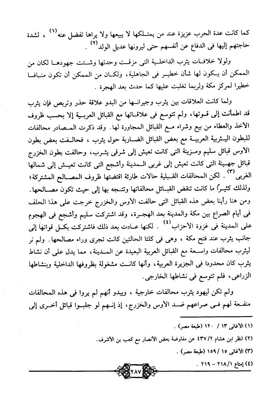 ومن هنا رأينا بعض هذه القبائل التي حالفت الأوس والخزرج خرجت على هذا الحلف في أيام الصراع بين مكة والمدينة بعد الهجرة، وقد اشتركت سليم وأشجع في الهجوم على المدينة في غزو الأحزاب4. لكنها عادت بعد ذلك فاشتركت بكل قواتها إلى جانب يثرب عند فتح مكة، وهي في كلتا الحالتين كانت تجري وراء مصالحها. ولم نر ليثرب محالفات واسعة مع القبائل العربية البعيدة عن المدينة، مما يدل على أن نشاط يثرب كان محدودًا في الجزيرة العربية، وأنها كانت مشغولة بظروفها الداخلية وبنشاطها الزراعي، فلم تتوسع في نشاطها الخارجي.