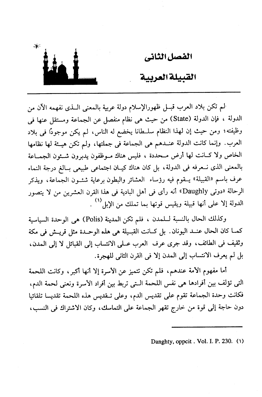 لم تكن بلاد العرب قبل ظهور الإسلام دولة عربية بالمعنى الذي نفهمه الآن من الدولة، فإن الدولة State من حيث هي نظام منفصل عن الجماعة ومستقل عنها في وظيفته؛ ومن حيث إن لهذا النظام سلطانًا يخضع له الناس، لم يكن موجودًا في بلاد العرب. وإنما كانت الدولة عندهم هي الجماعة في جملتها، ولم تكن هيئة لها نظامها الخاص ولا كانت لها أرض محددة، فليس هناك موظفون يدبرون شئون الجماعة بالمعنى الذي نعرفه في الدولة، بل كان هناك كيان اجتماعي طبيعي بالغ درجة النماء عرف باسم القبيلة يقوم فيه رؤساء العشائر والبطون برعاية شئون الجماعة، ويذكر الرحالة دوتي Daughly أنه رأى في أهل البادية في هذا القرن العشرين من لا يصور الدولة إلا على أنها قبيلة ويقيس قوتها بما تملك من الإبل1.
