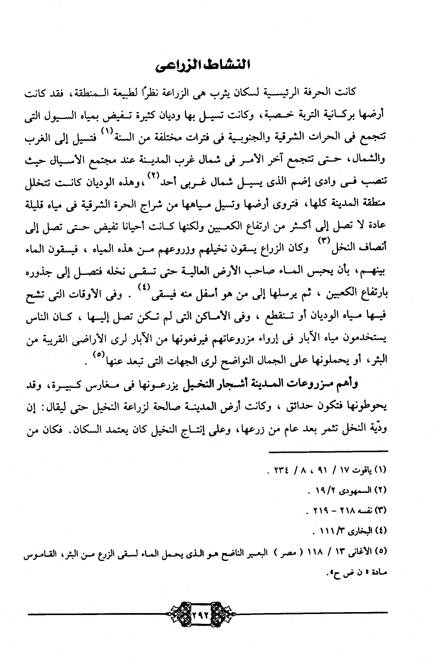 كانت الحرفة الرئيسية لسكان يثرب هي الزراعة نظرًا لطبيعة المنطقة، فقد كانت أرضها بركانية التربة خصبة، وكانت تسيل بها وديان كثيرة تفيض بمياه السيول التي تتجمع في الحرات الشرقية والجنوبية في فترة مختلفة من السنة1، فتسيل إلى الغرب والشمال، حتى تتجمع آخر الأمر في شمال غرب المدينة عند مجتمع الأسيال حيث تنصب في وادي إضم الذي يسيل شمال غربي أحد2، وهذه الوديان كانت تتخلل منطقة المدينة كلها، فتروي أرضها وتسيل مياهها من شراج الحرة الشرقية في مياه قليلة عادة لا تصل إلى أكثر من ارتفاع الكعبين؛ ولكنها كانت أحيانًا تفيض حتى تصل إلى أنصاف النخل3، وكان الزراع يسقون نخيلهم وزروعهم من هذه المياه، فيسوقون الماء بينهم، بأن يحبس الماء صاحب الأرض العالية حتى تسقي نخله فتصل إلى جذوره بارتفاع الكعبين، ثم يرسلها إلى من هو أسفل منه فيسقي4. وفي الأوقات التي تشح فيها مياه الوديان أو تنقطع، وفي الأماكن التي لم تكن تصل إليها، كان الناس يستخدمون مياه الآبار في إرواء مزروعاتهم فيرفعونها من الآبار لري الأراضي القريبة من البئر، أو يحملونها على الجمال النواضح لري الجهات التي تبعد عنها5.