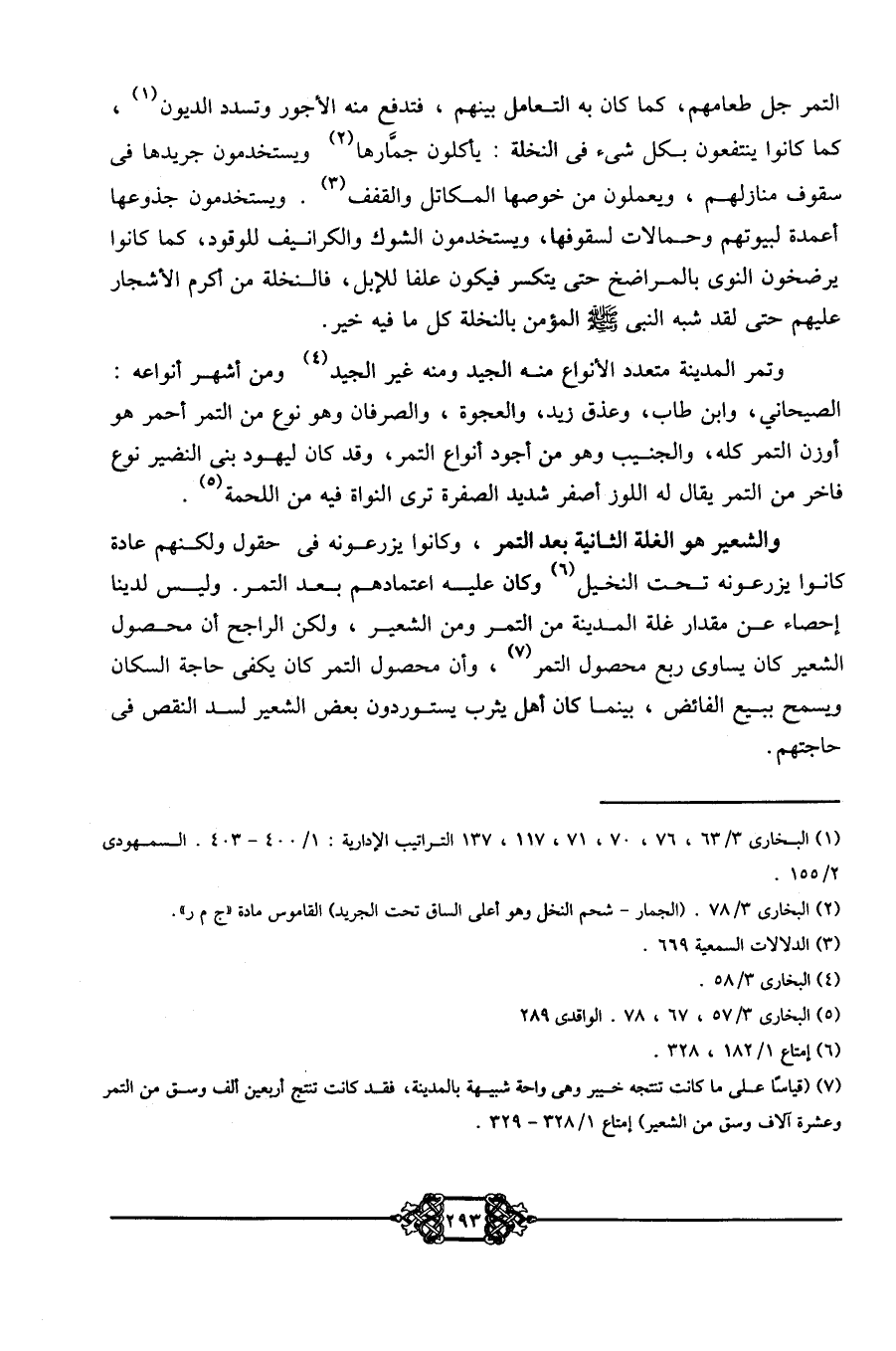7 "قياسًا على ما كانت تتجه خيبر وهي واحة شبيهة بالمدينة، فقد كانت تنتج أربعين ألفًا وسق من التمر وعشرة آلاف وسق من الشعير" إمتاع 1/ 328- 329.