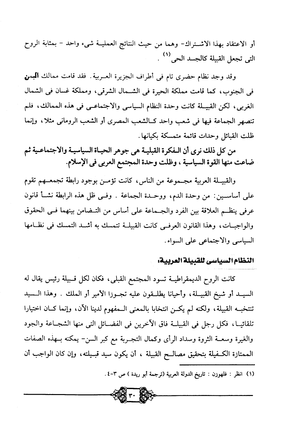 من كل ذلك نرى أن الفكرة القبلية هي جوهر الحياة السياسية والاجتماعية، ثم ضاعت منها القوة السياسية، وظلت وحدة المجتمع العربي في الإسلام.